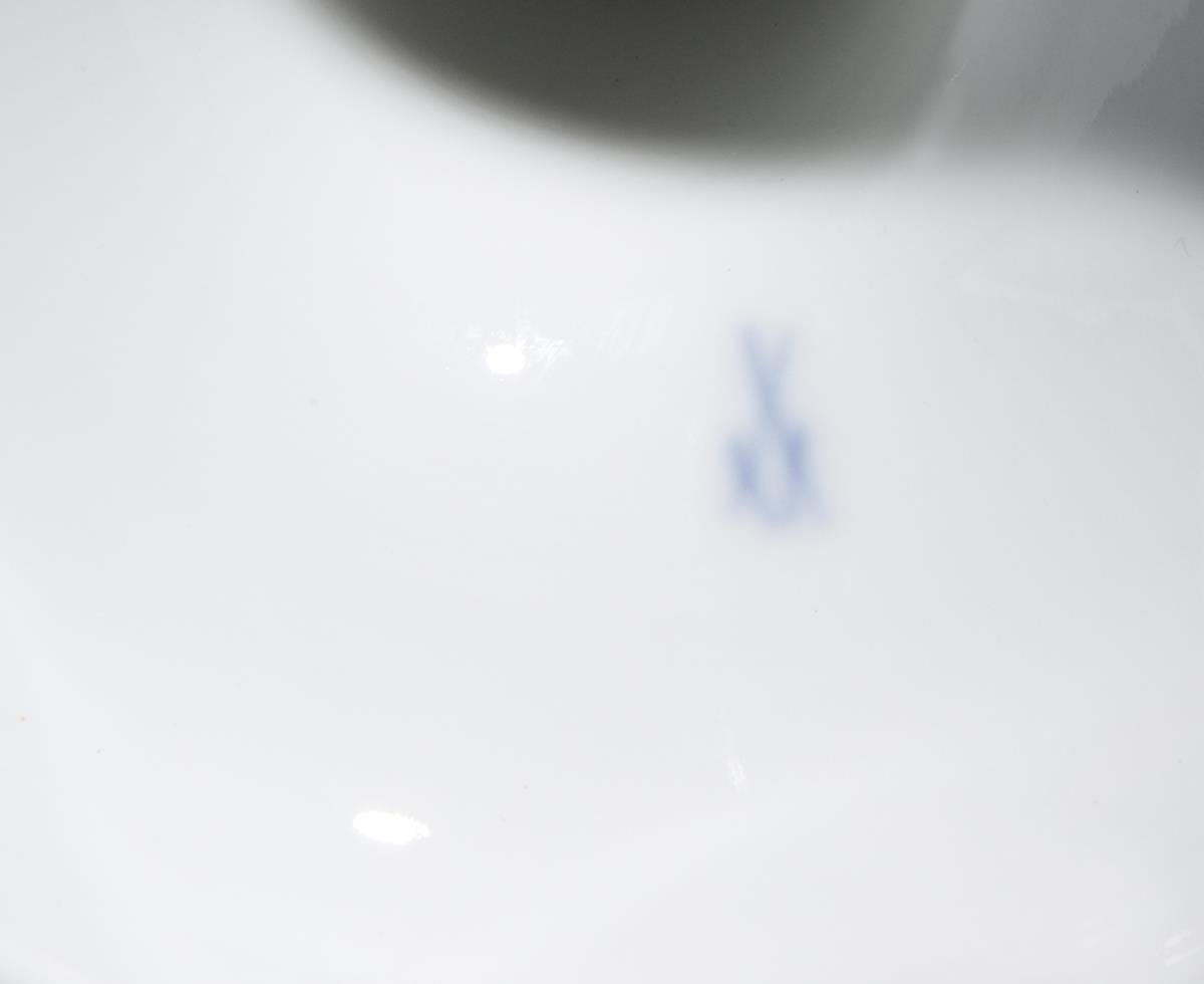 Balusterkorpus mit seitlichen Schwanenhals-Handhaben über montiertem Rundfuß. Beidseits farbige florale Bemalung, Goldstaffage. Pressmarke, Ritzmarke, Schwertermarke 1. Wahl.