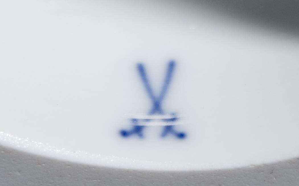 Balusterkorpus mit seitlichen Voluten-Handhaben über montiertem Standfuß. Beidseits farbige florale Bemalung nach Eduard Braunsdorf, Goldstaffage. Datierte Widmung an den Dreher Gustav Zettler zum 40-jährigen Manufaktur-Jubiläum. Pressmarke, Ritzmarke, Schwertermarke zweimal gestrichen.