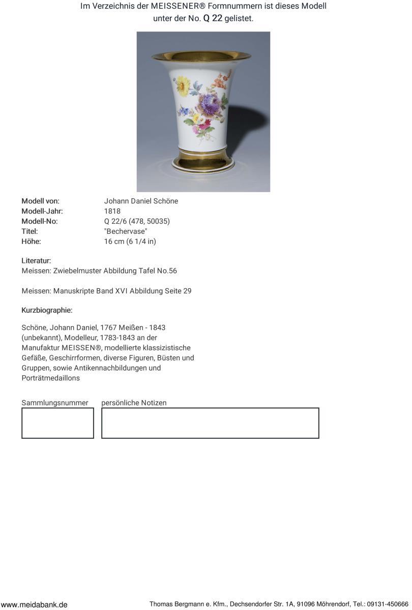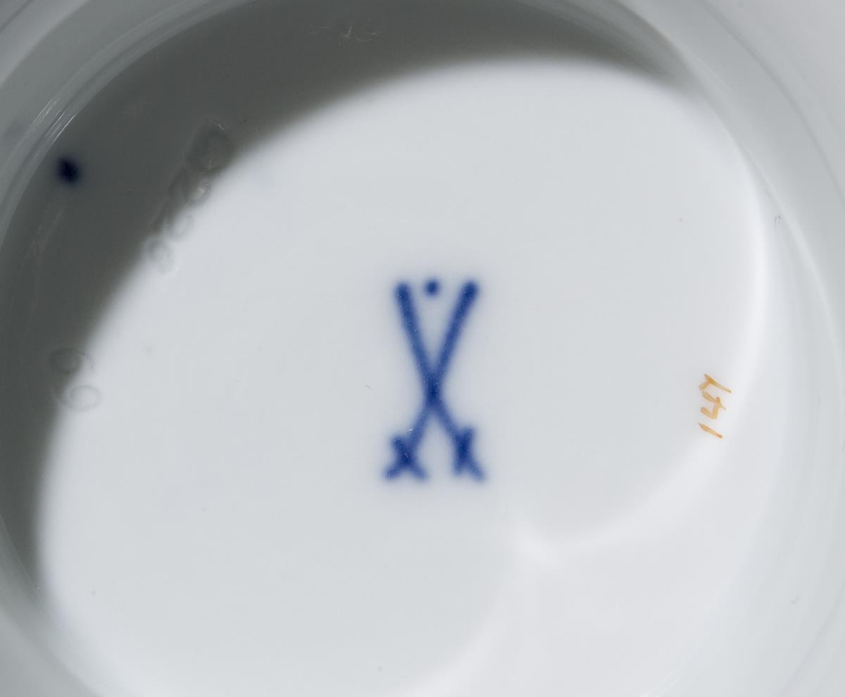 Frontal passig geschweifte Goldreserve mit farbiger floraler Bemalung, gold staffierte Ränder. Form nach einem Modell von 1818. Pressmarken, Malermarke, Schwertermarke mit Punkt 1. Wahl.