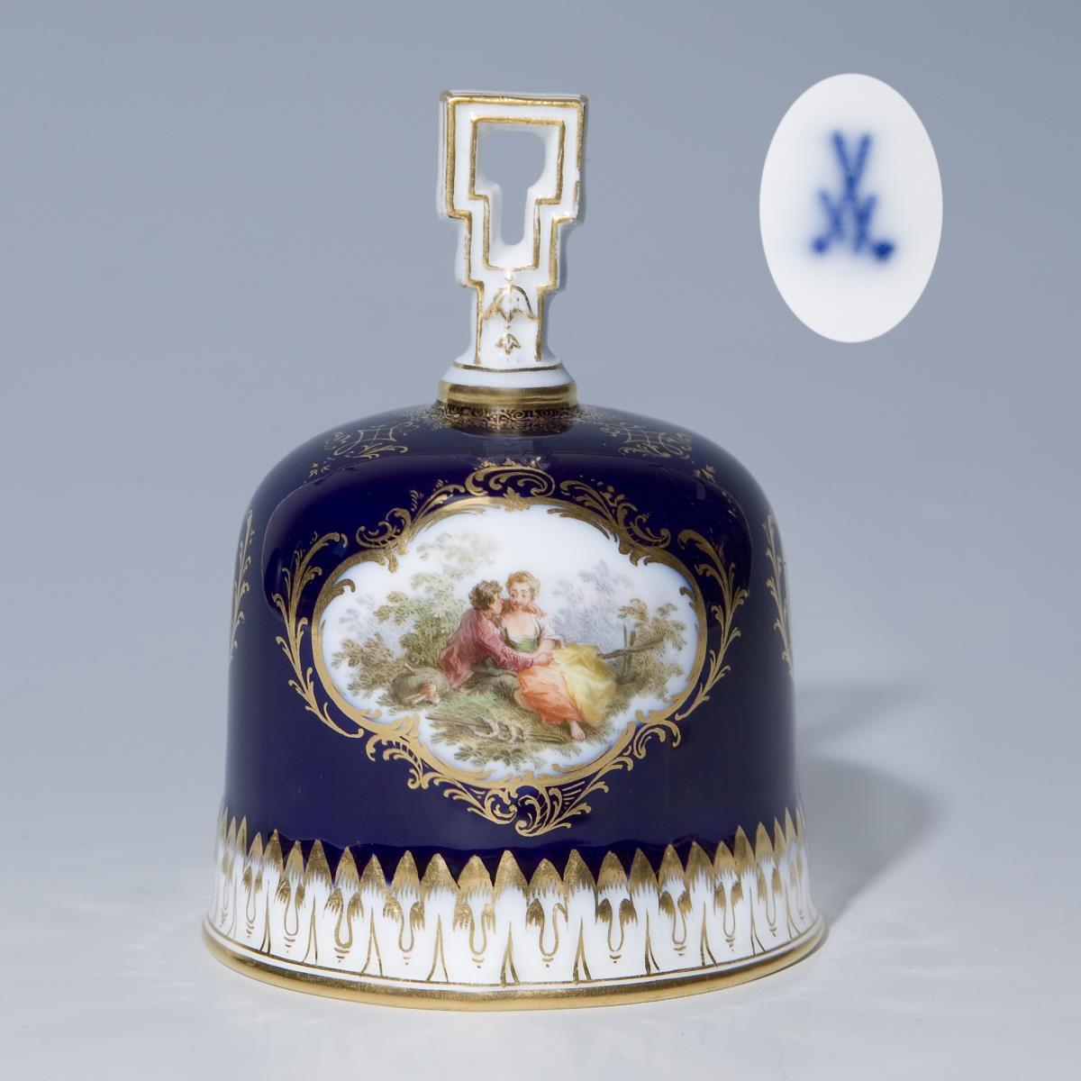 Umlaufend drei passig geschweifte Goldreserven mit feiner farbiger Bemalung. Dekor mit Blumen-Bukettes und "Schäferszene". Goldspitzenbordüren, Goldstaffage. Innen eingehangener Holz-Klöppel an Messing-Steg. Schwertermarke innen 1. Wahl.