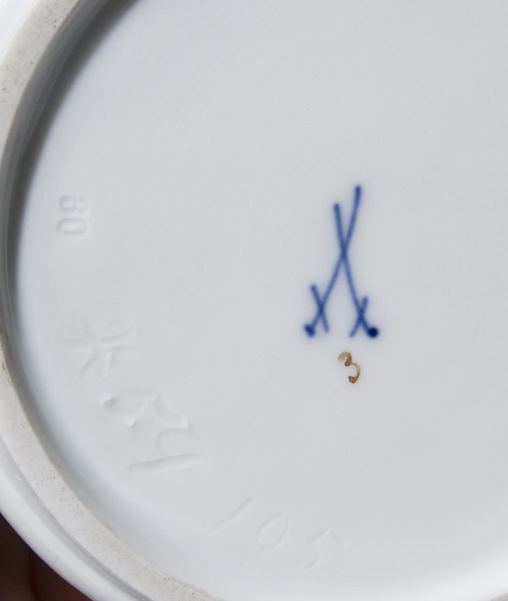 Umlaufend plastisch aufgelegte, naturalistisch bemalte Blütenzweige. Gold staffierte Ränder. Ritzmarke, Pressmarke, Malermarke, Schwertermarke 1. Wahl.