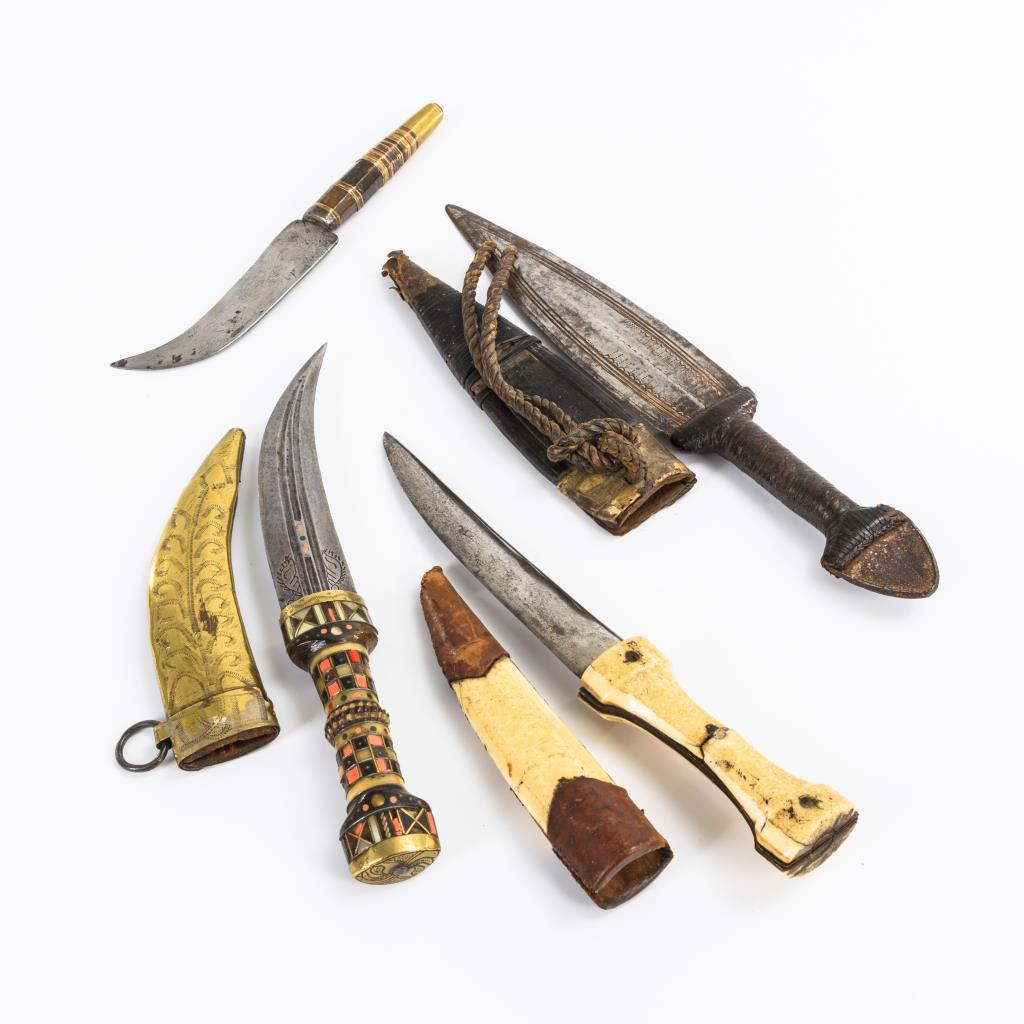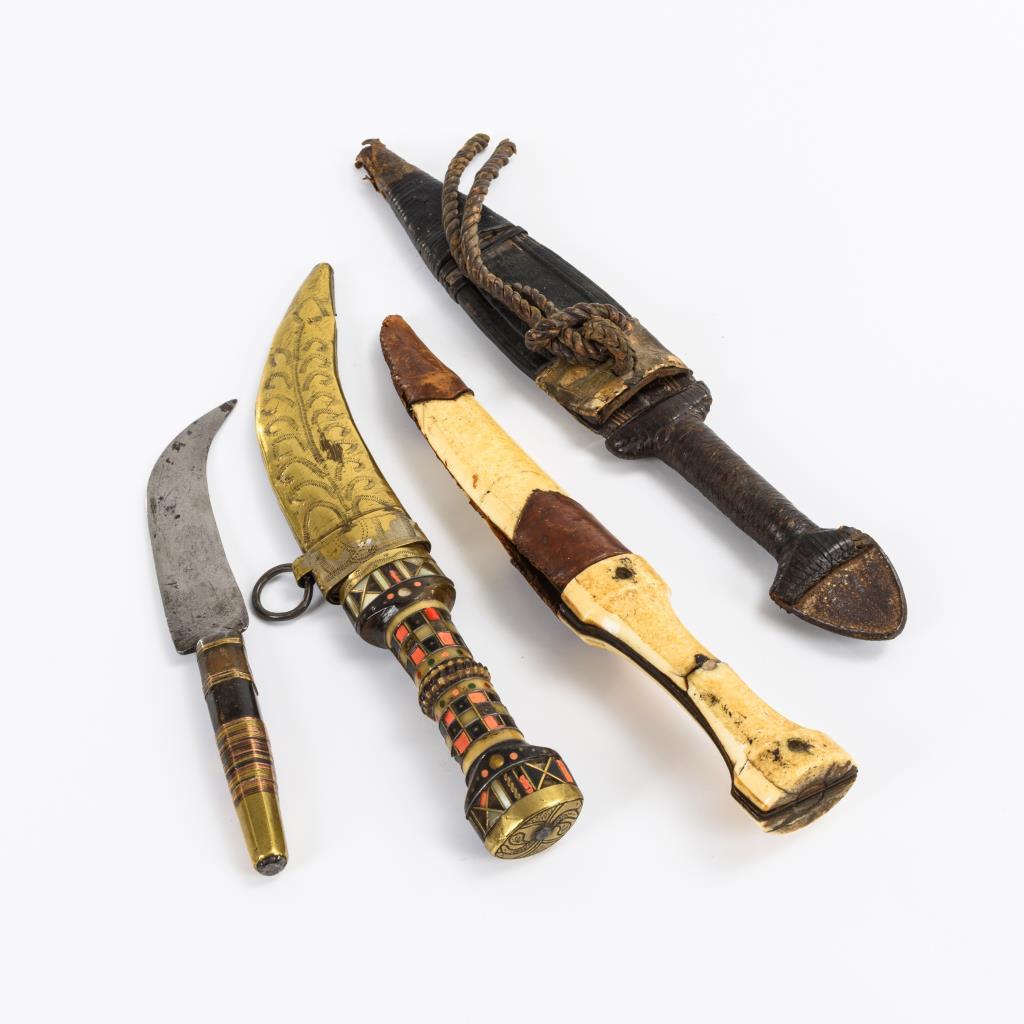 Krummdolch: Griff aus Knochen, Horn, Perlmutt und Koralle(?). Ziselierte, zweischneidige Klinge mit kleinen Einlagen. Gravierte Messingscheide. Rückseite von Griff und Scheide einfacher gestaltet, dort Messingeinlage mit Signatur. L 28 cm. / Zweischneidige, gravierte Klinge mit Ledergriff und geprägter Lederscheide. Knauf als Metallkeil. L 32 cm. / Beinmesser: Dicke, zweischneidige Klinge. Griff und Scheide aus Bein, mit Lederrand. Scheide seitlich gerissen, Griff mit Quersprung einer Halbschale. L 27,5 cm. / Arbeitsmesser mit gekrümmter Klinge. Schwerer Griff mit Kupfer- und Messingdraht kunstvoll umwickelt. L 21 cm.