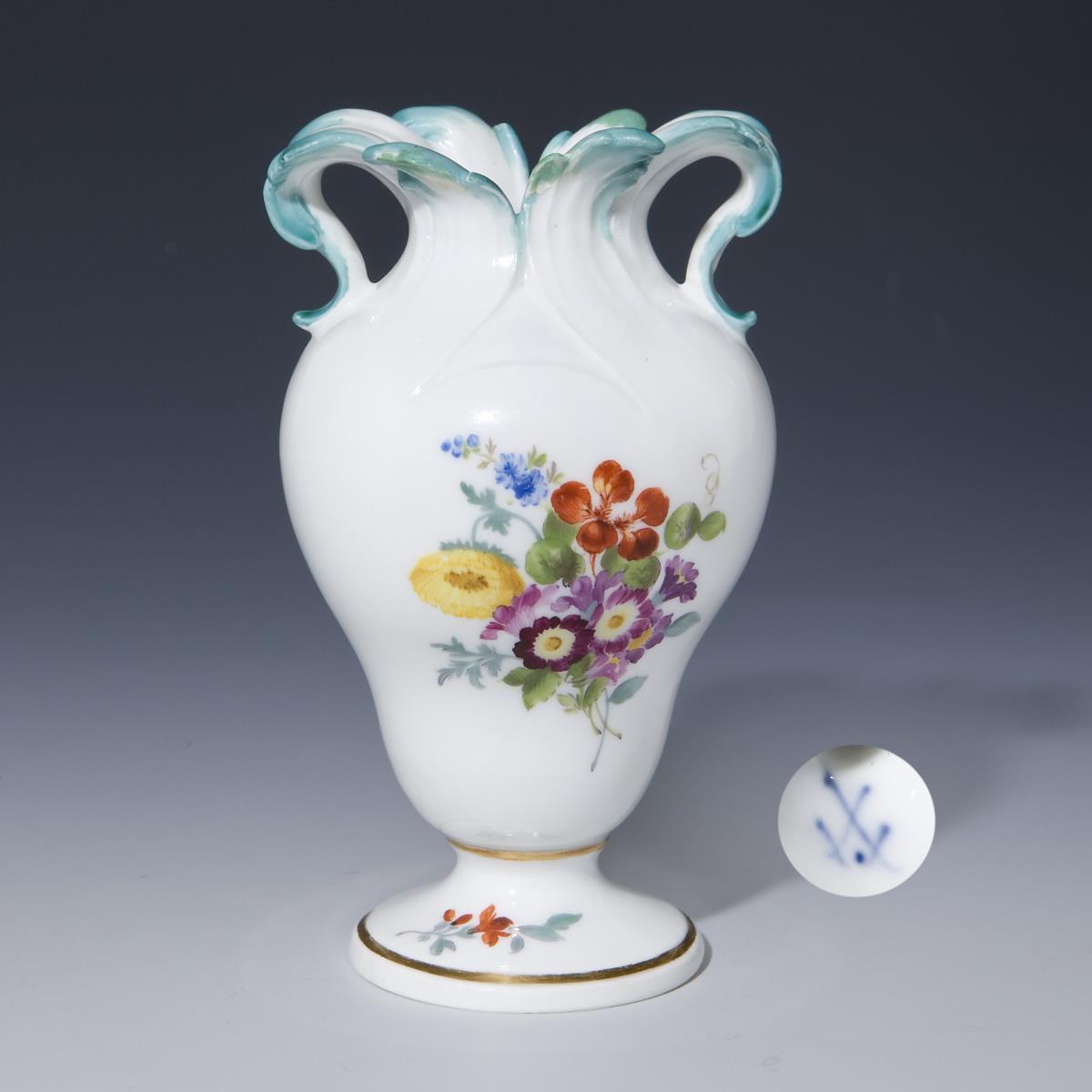 Balusterkorpus mit reliefierter Blatt-Mündung. Umlaufend farbige Blumenbemalung, seegrün und gold staffiert. Schwertermarke mit Punkt.