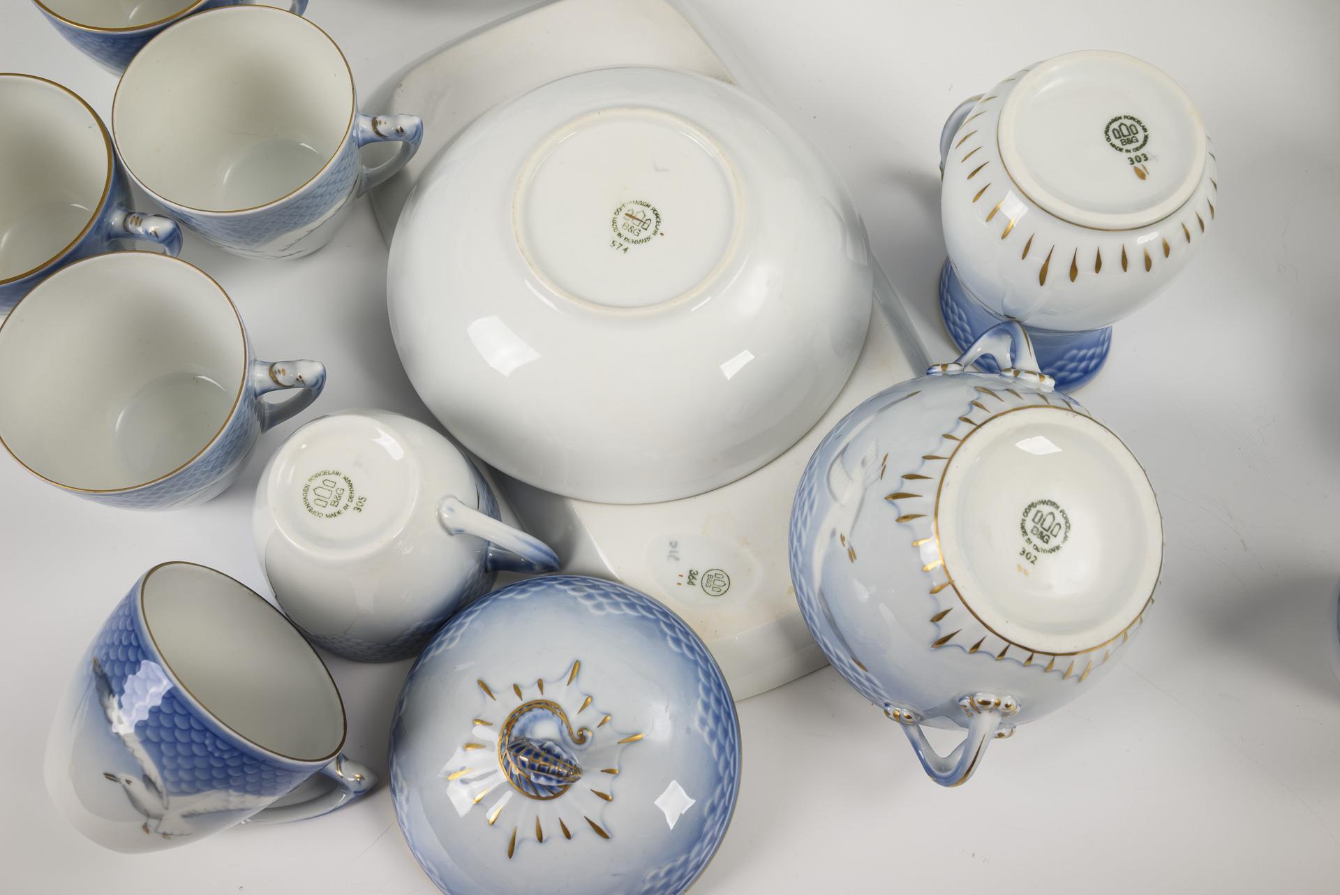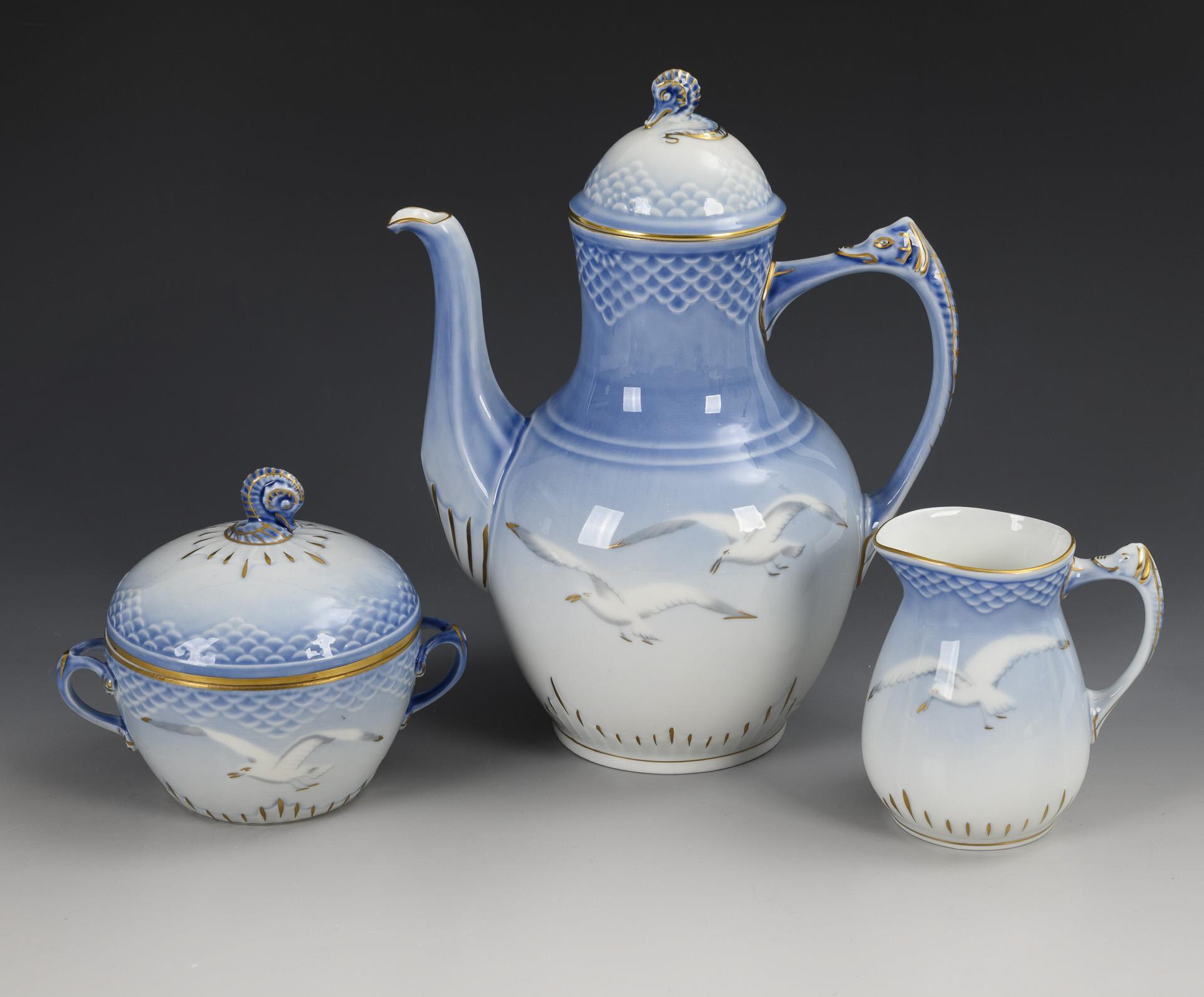 43 pieces. Coffee pot (H 24.5 cm), milk jug, sugar bowl, 12 cups with 12 saucers, 12 cake plates, 1 bowl (Ø 16 cm), 1 leaf bowl (L 24.5 cm), 1 credenza plate (Ø 27 cm) and 1 tray (L 27 cm).