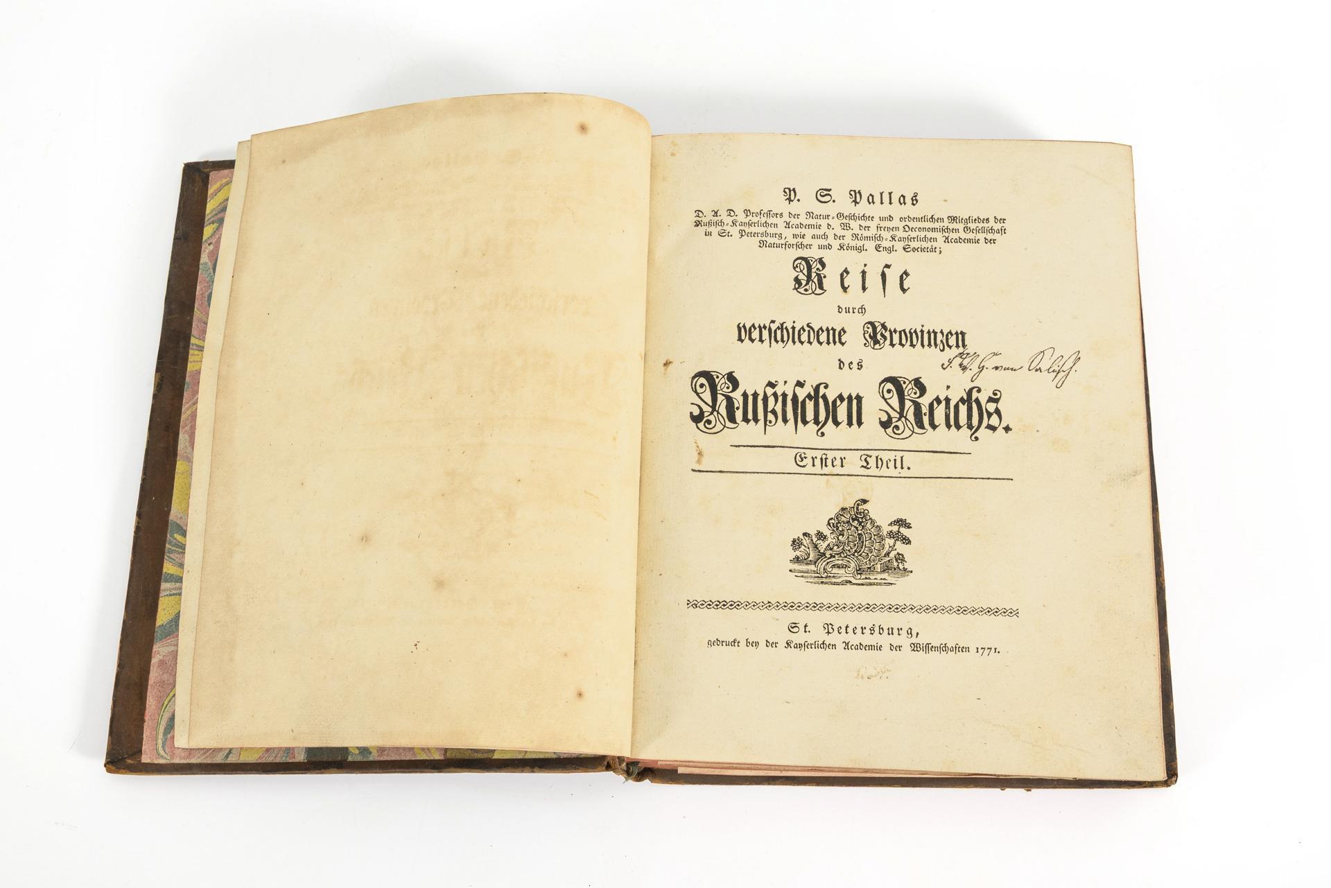 "In 1767, Tsarina Catherine II appointed him as an associate member and adjunct at the Academy in St. Petersburg and soon afterwards as professor of natural history and head of the natural history cabinet. P. was also commissioned to lead a major scientific expedition to Siberia. The explorations included the search for minerals and natural resources, the investigation of soils, waters, plants and animals with regard to their possible usability, surveys of the state of agriculture, crafts, trades and arts, the description of natural history, ethnic and cultural-historical objects, the depiction of mountain forms, astronomical observations and geographical localizations. .... The Academy had already published P.'s manuscripts as "Reise durch verschiedene Provinzen des Russ. Reich" (3 parts, 1771/73/76) in German, thereby strengthening his international reputation. " (NDB 20/2001).