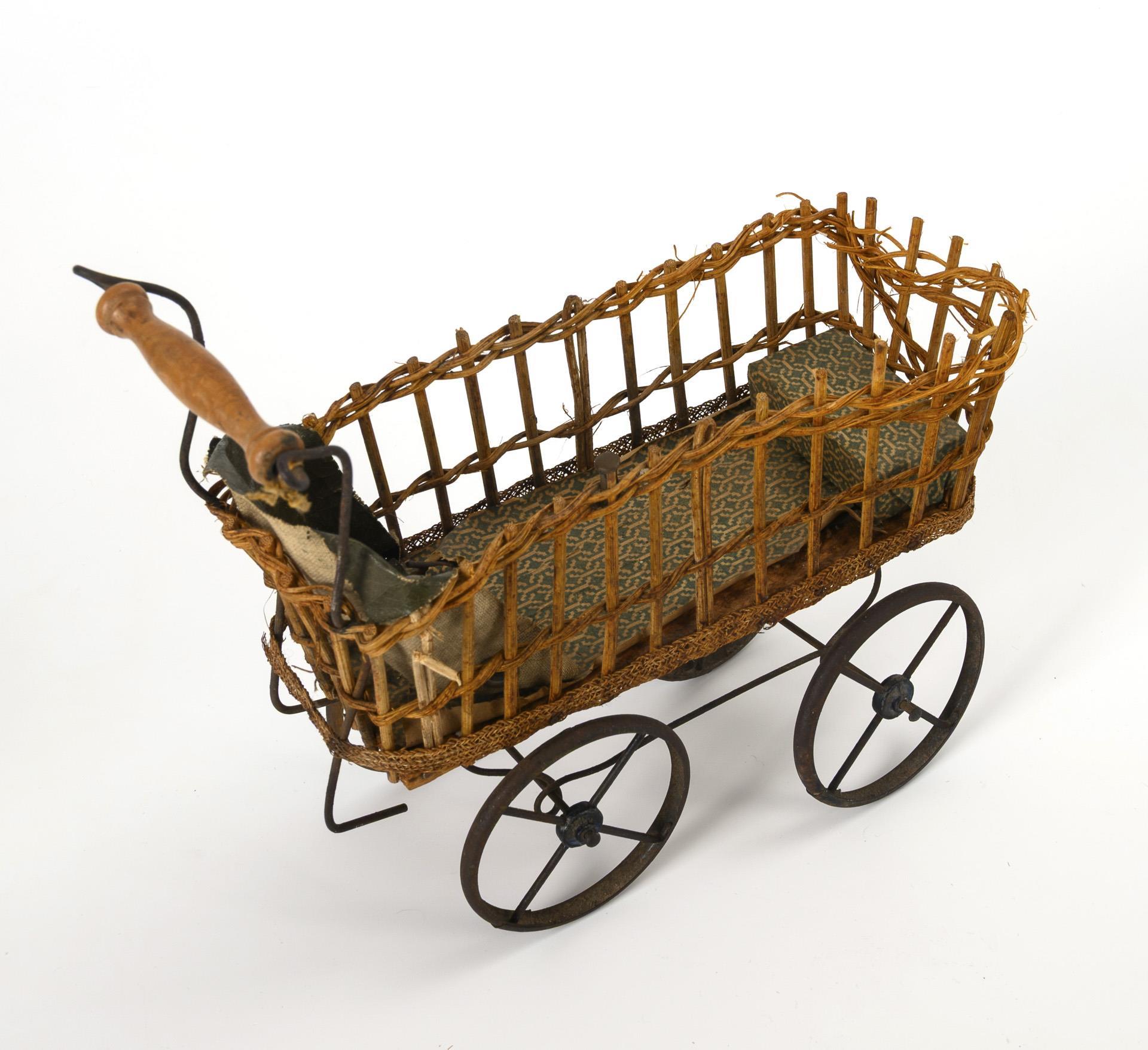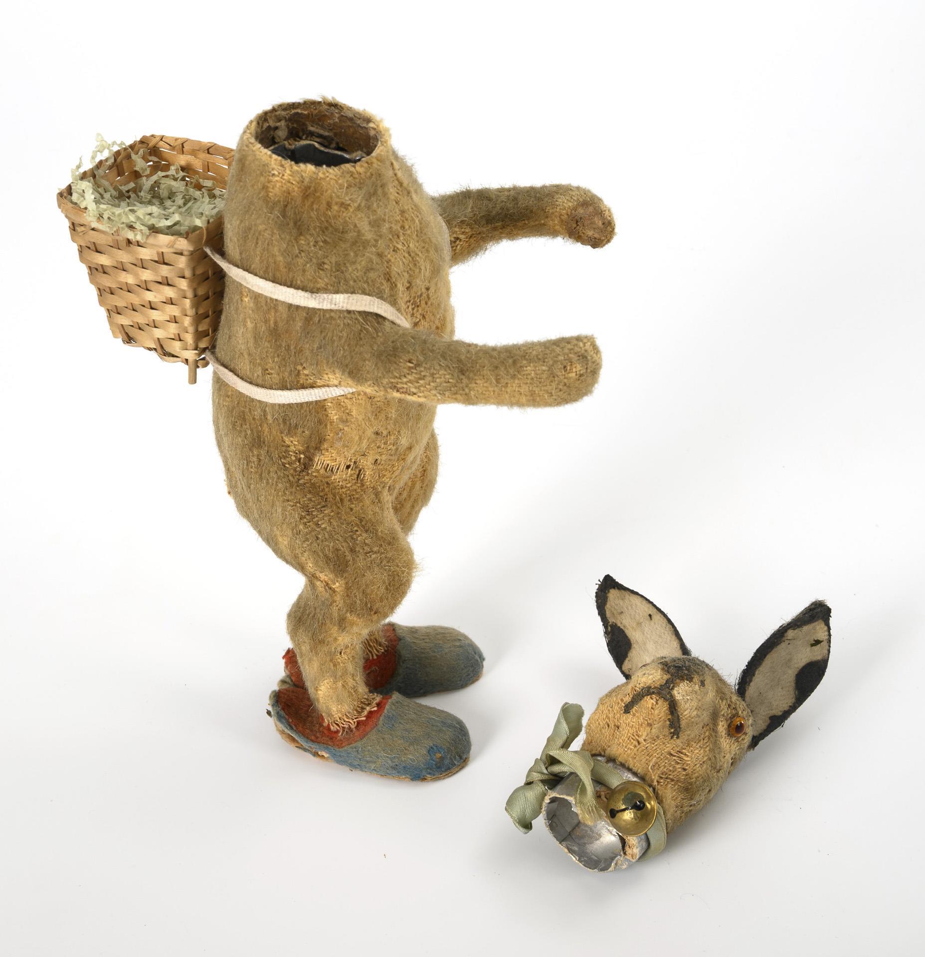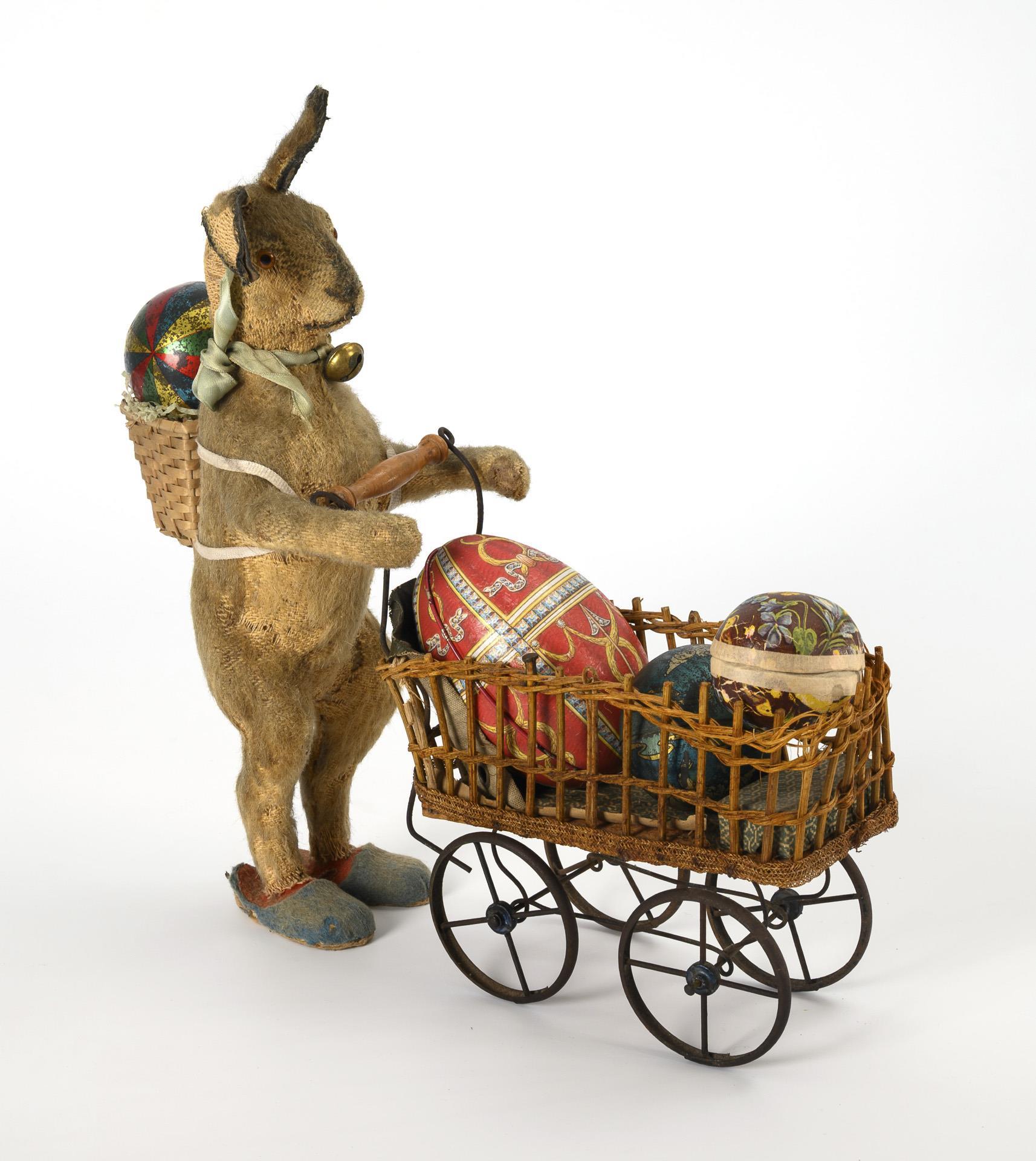 Old mohair Easter bunny with removable head and blue felt slippers. Basket added later, h 34 cm. Comes with an old doll's pram, 2 filling eggs and 2 tin balls for filling. Signs of age.