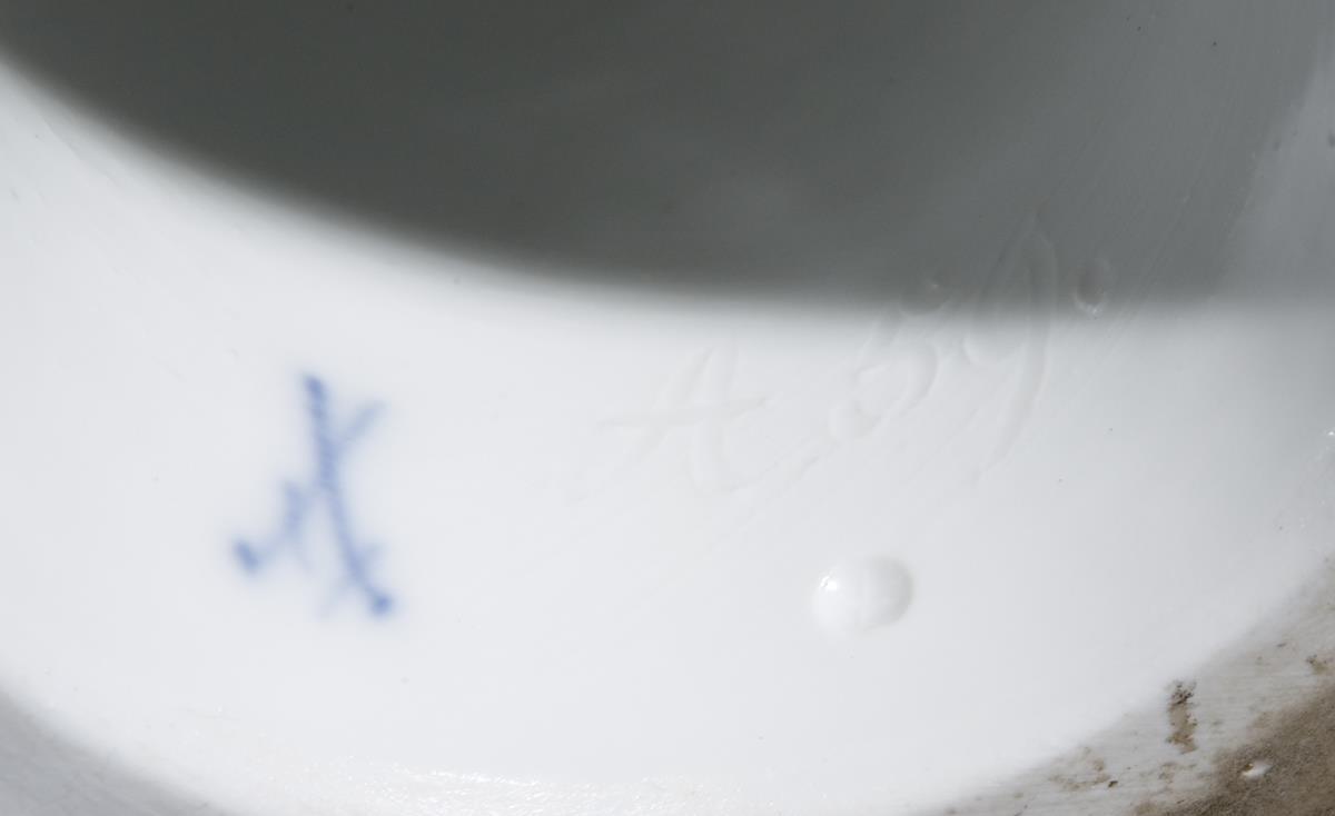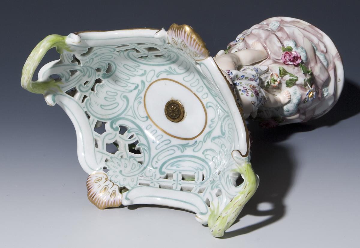 Die durchbrochen gearbeitete Schale und Sockel umlaufend mit plastisch aufgelegten Blütenzweigen. Figurenschaft mit Amoretten auf Fels-Sockel. Farbig bemalt, gold staffiert. Ritzmarke, Malermarke, Schwertermarke 1. Wahl.