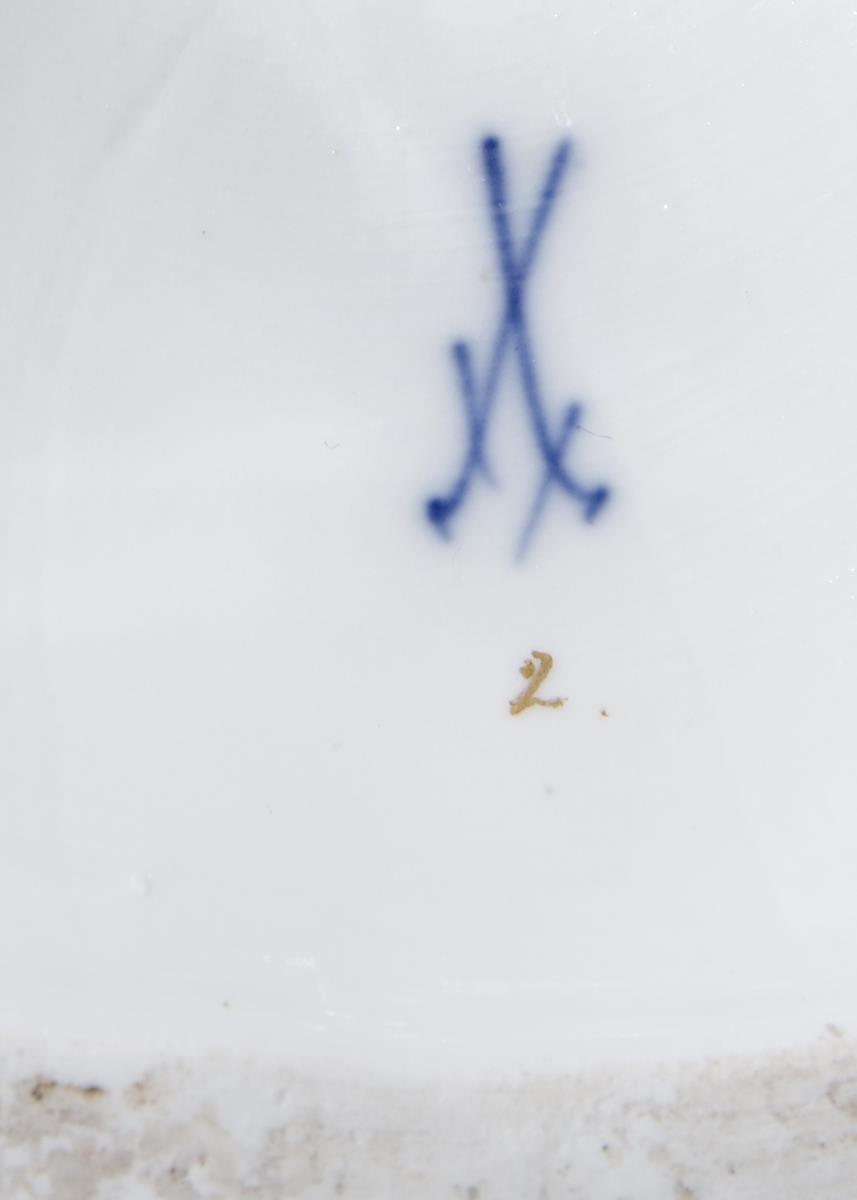 Modell von Ernst August Leuteritz (unter Verwendung alter Formen). Gold staffiert. Gesichter farbig staffiert. Vollplastischer Figurenschaft mit Gärtnerfiguren. Ritzmarken, Pressmarken, Malermarken, Schhwertermarken 1. Wahl.
