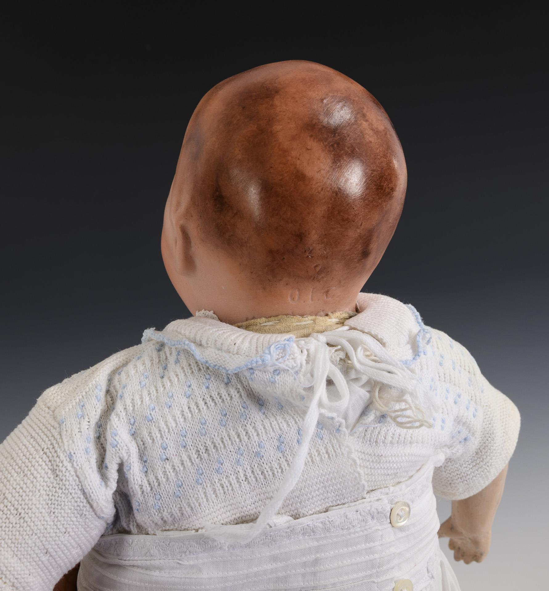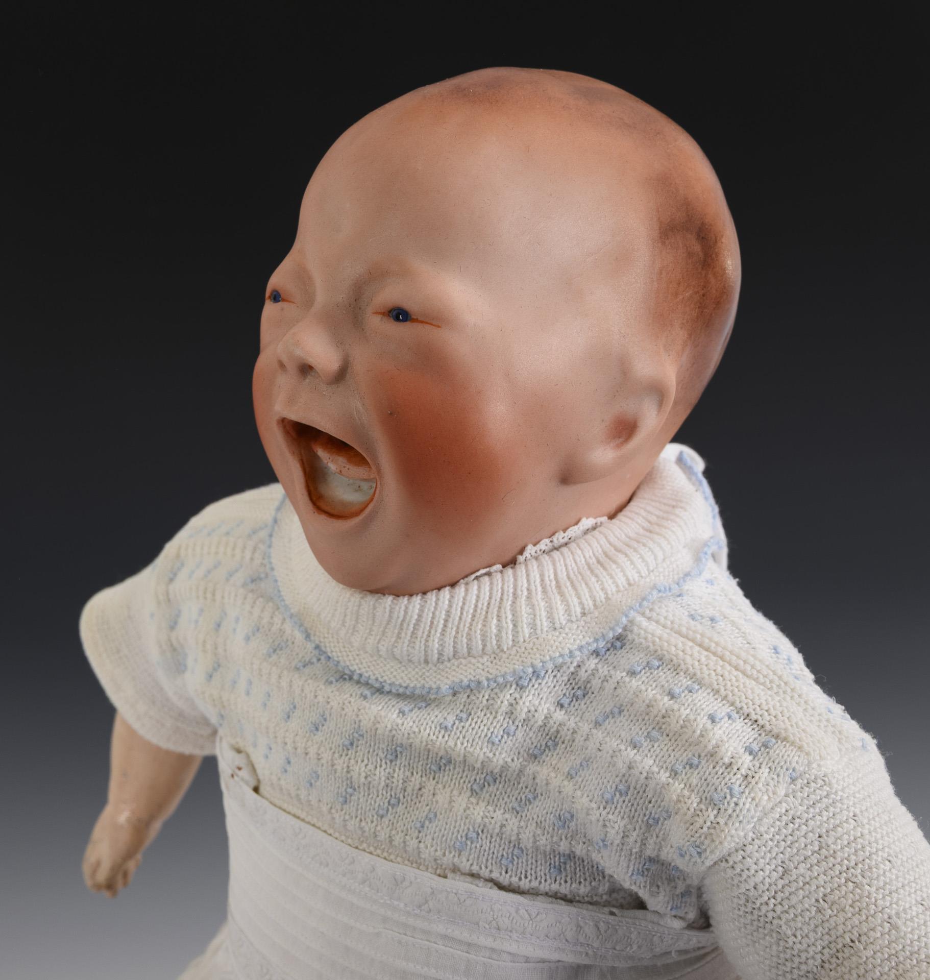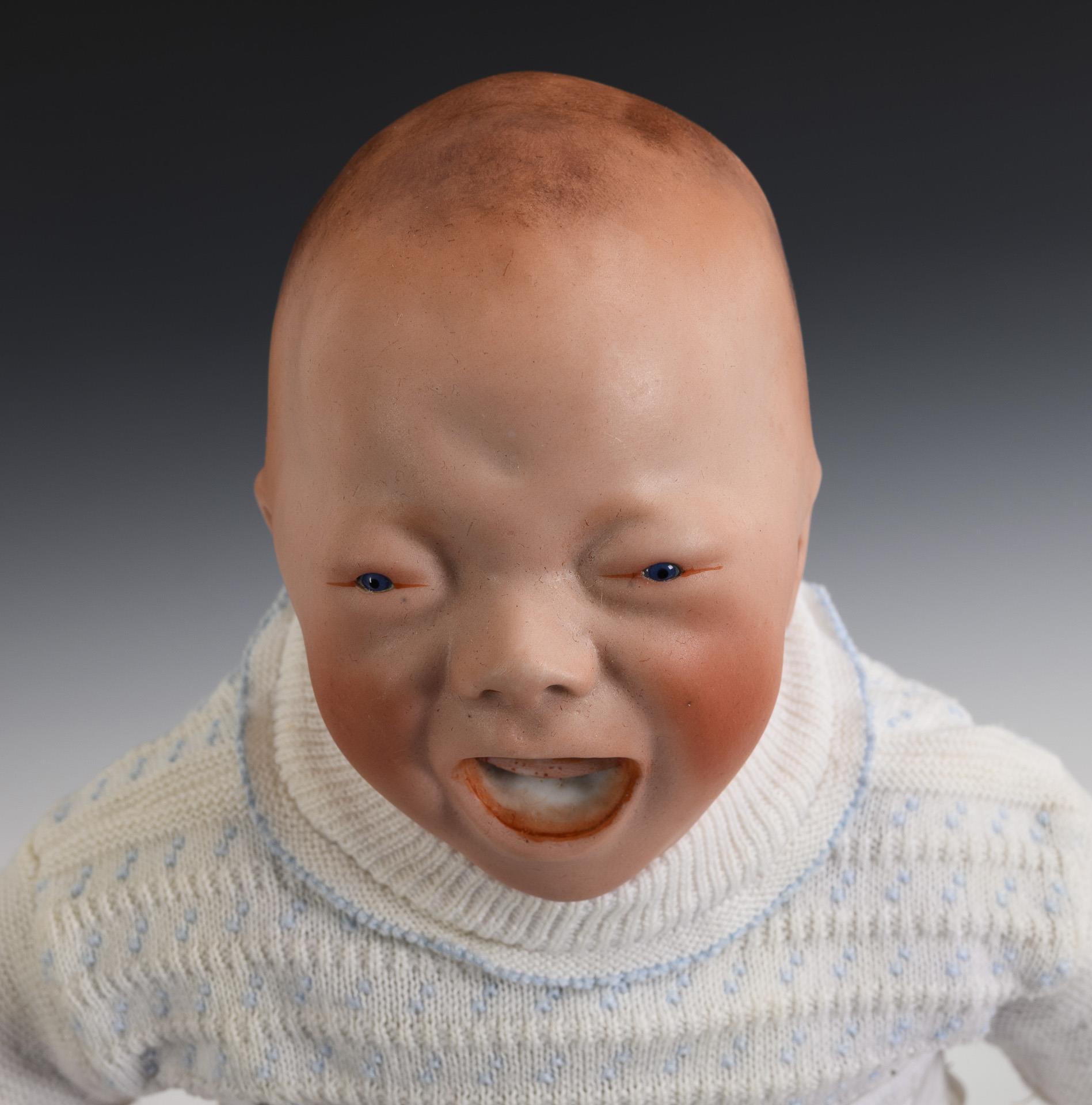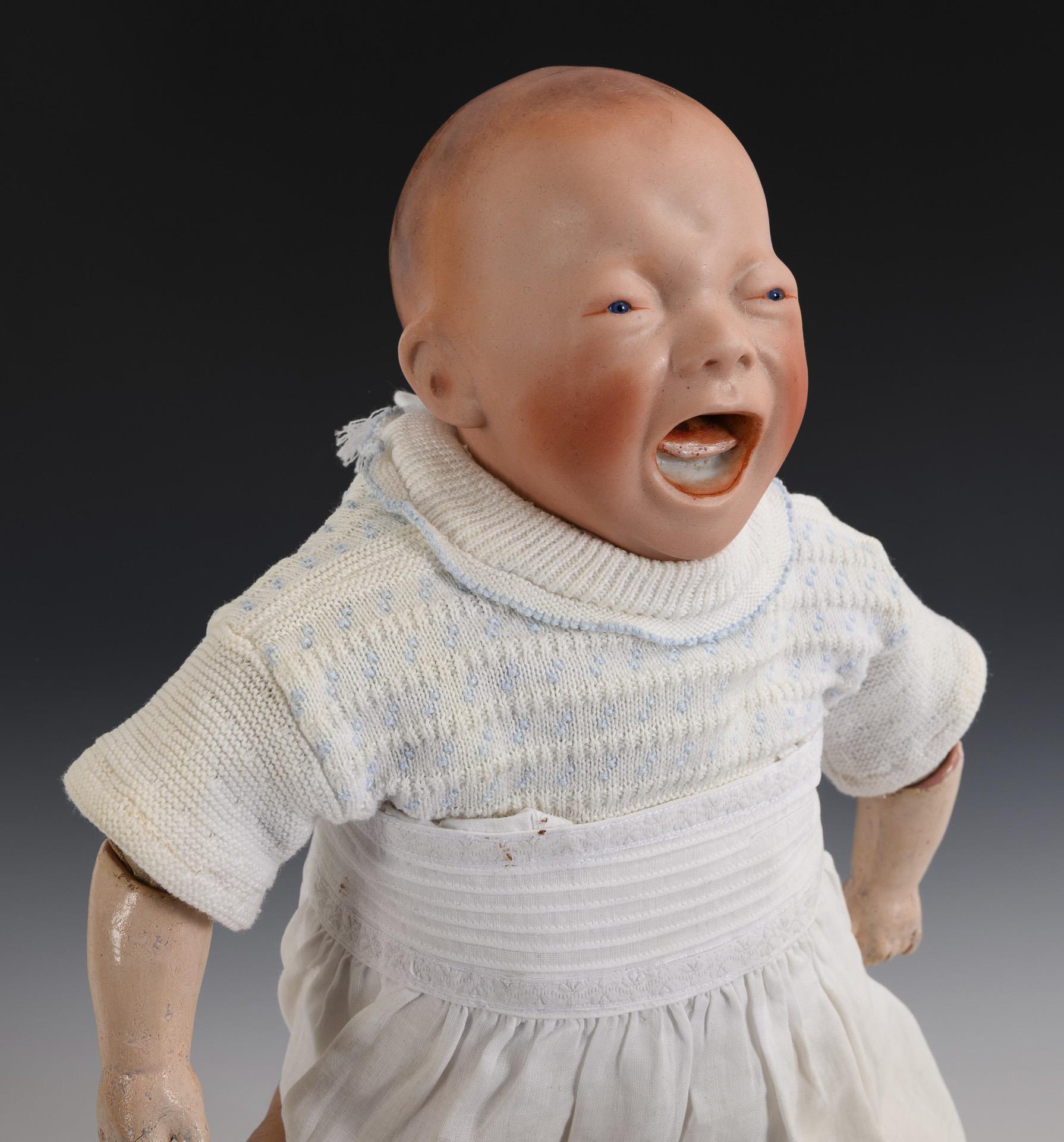 Grotesquely modeled character baby with binding head, crying, open/closed mouth and tiny glass eyes. Softly stuffed body with mass arms, white dress. Comes with 2 pink pillows.