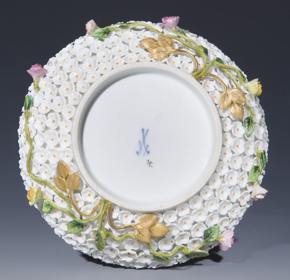 Modell von Johann Joachim Kaendler 1760. Die gesamte Oberfläche mit gelb staffierten Blüten belegt. Umlaufend plastisch aufgelegte Zweige mit drei Vögeln, naturalisch bemalt, Zweige partiell vergoldet. Ritzmarke, Malermarken, Schwertermarken 1. Wahl.