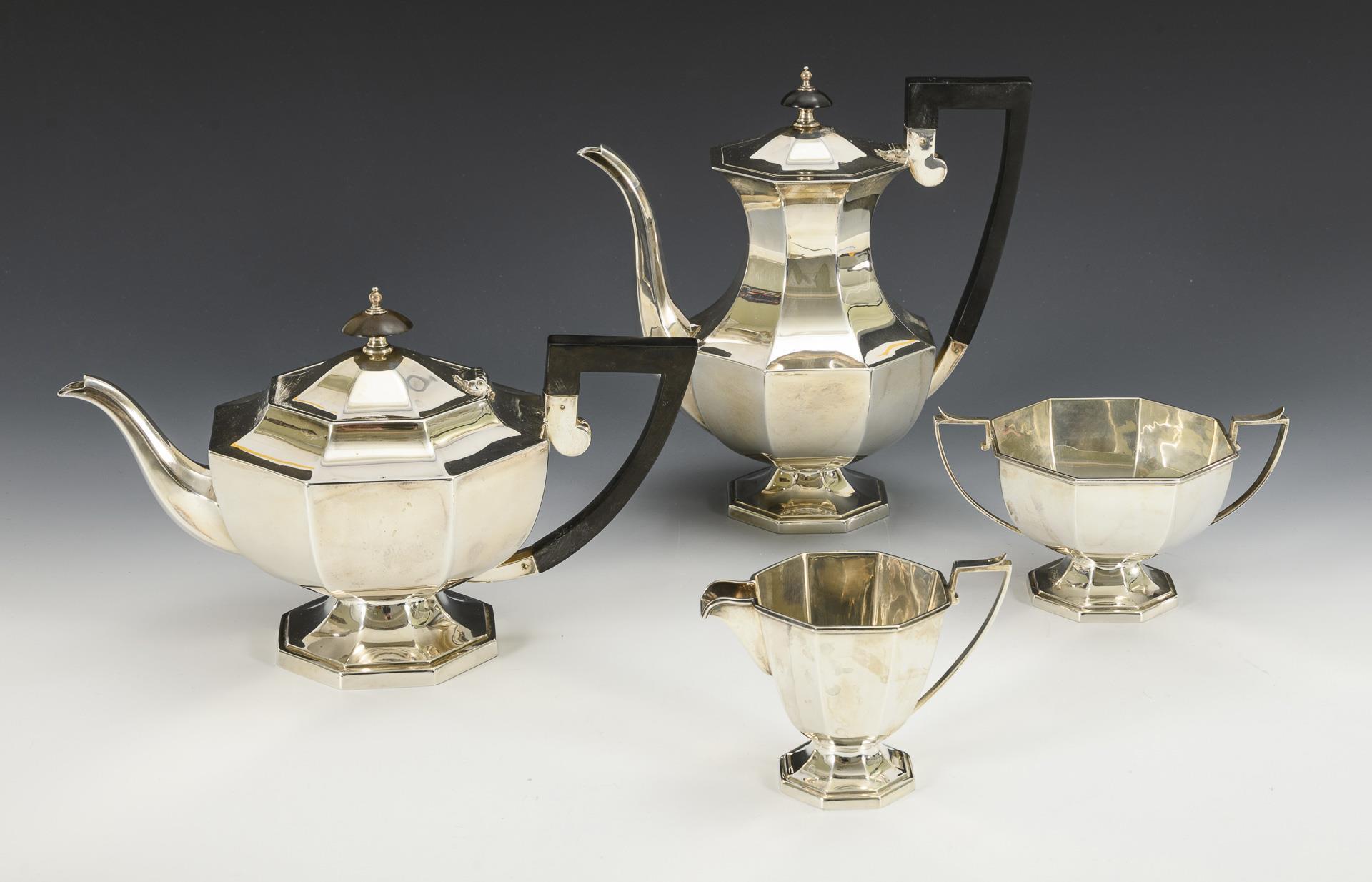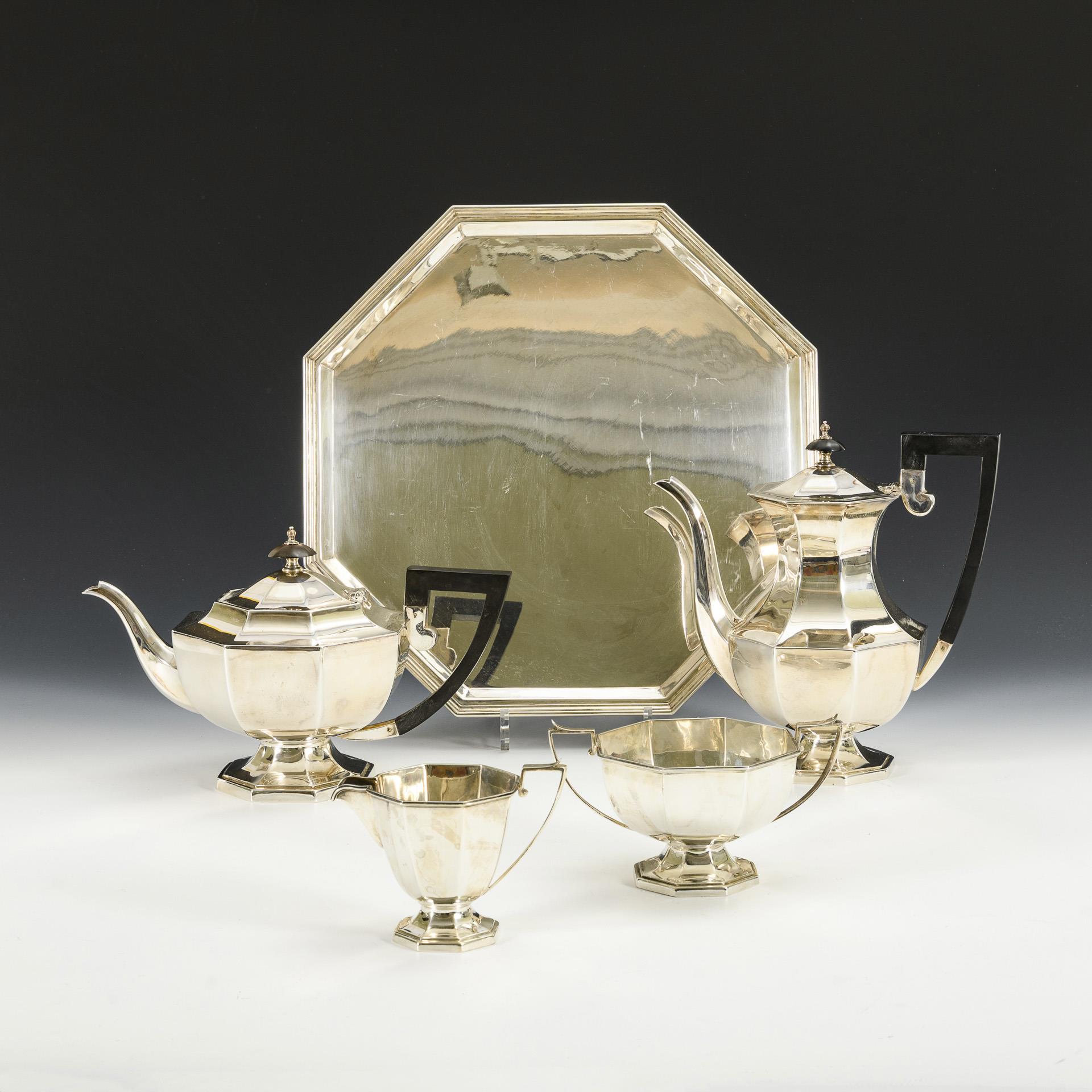 2 jugs, sugar bowl and milk jug in faceted form, on octagonal tray. Coffee pot (h 22.5 cm) and teapot (h 14.5 cm) with ebonized wooden handle and knob. Tray with light scratches.