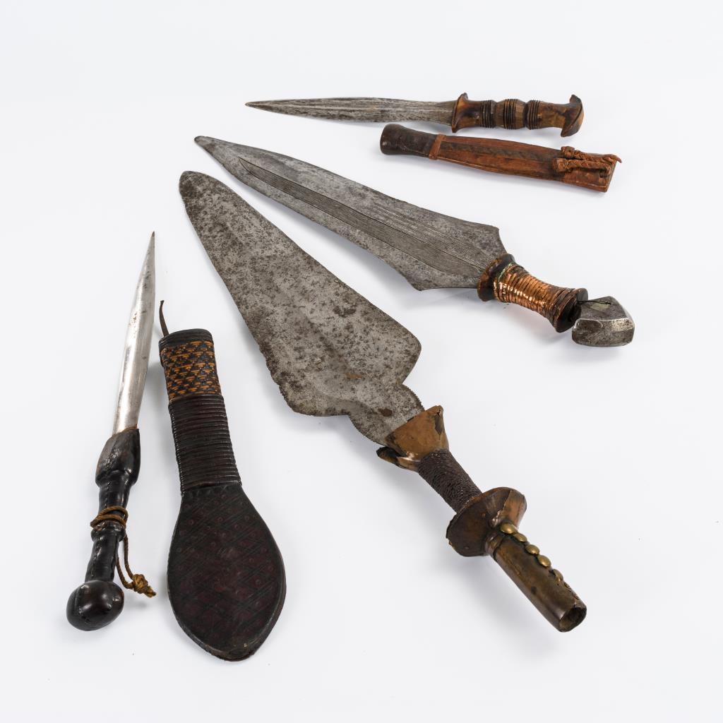 Zweischneidige Lanzenklinge mit Teilen des Schaftes (Schaft mit Defekten). L 53 cm. / Messer mit breiter, fein gemusterter Klinge. Keilförmiger Eisenknauf. Solche Stücke werden auch als Währung gehandelt (Zentralafrika). L 43 cm. / Einfache Klinge, sehr spitz zulaufend, in schön gearbeiteter Lederscheide. L 36 cm. / Leichtes Gebrauchsmesser mit Holzgriff und Lederscheide. L 29 cm.