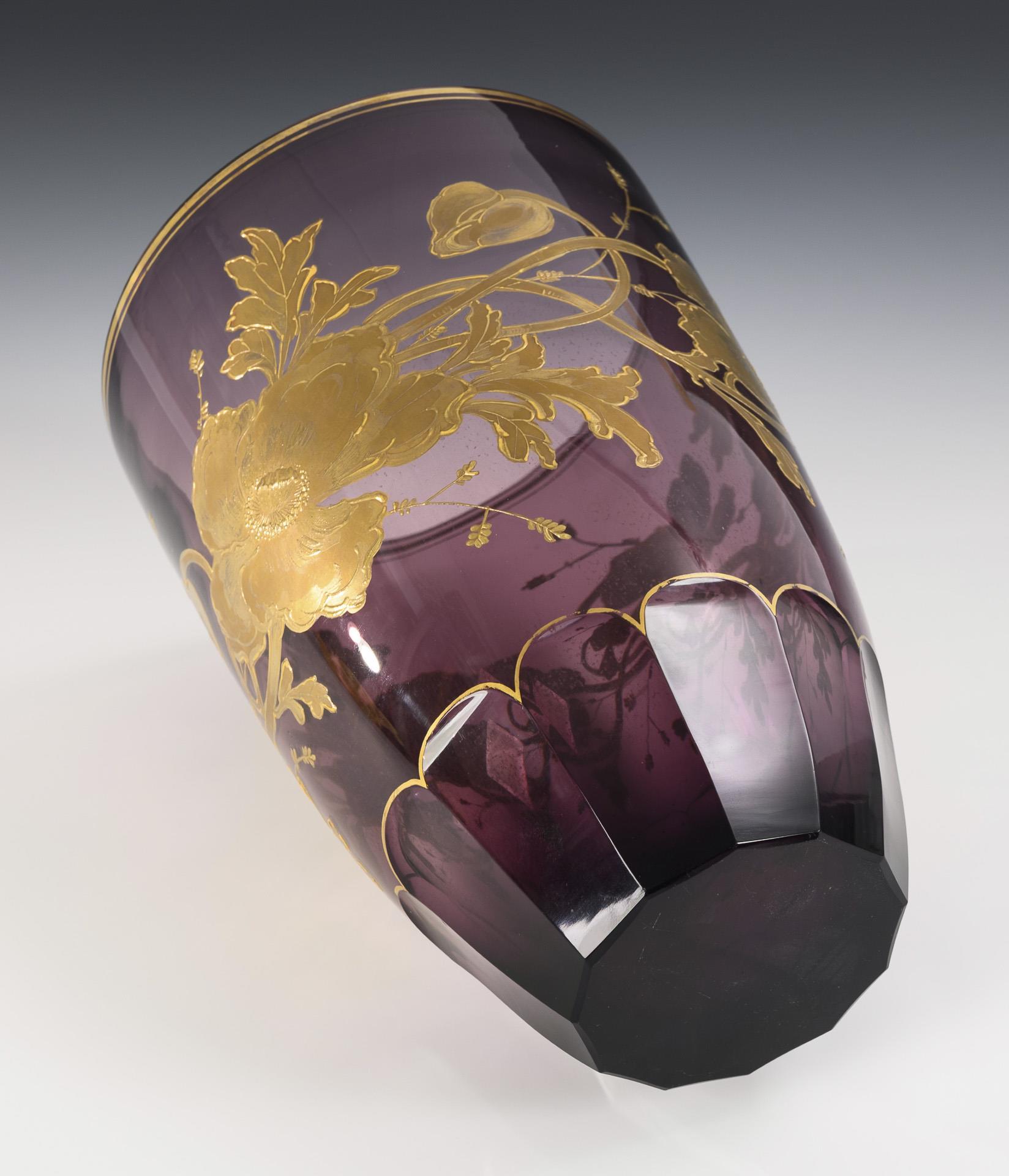 Faceted vase of violet glass on the stand. Poppy stems painted in gold in relief all around. Minimal gold abrasion in places.