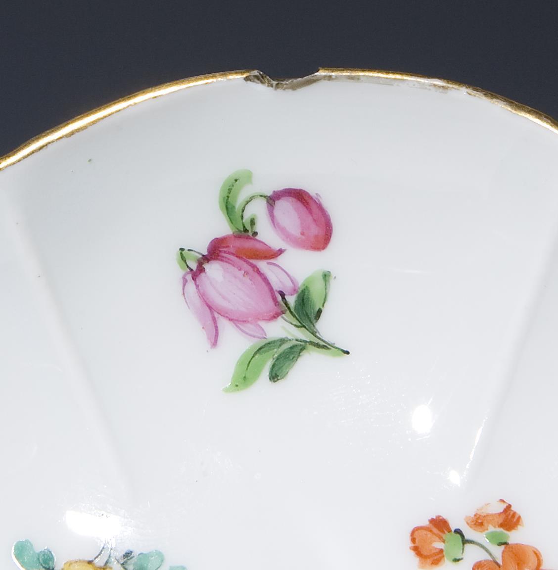 Untertassenränder, Blüten, Blätter partiell bestoßen. Ein Standfüßchen fehlt.