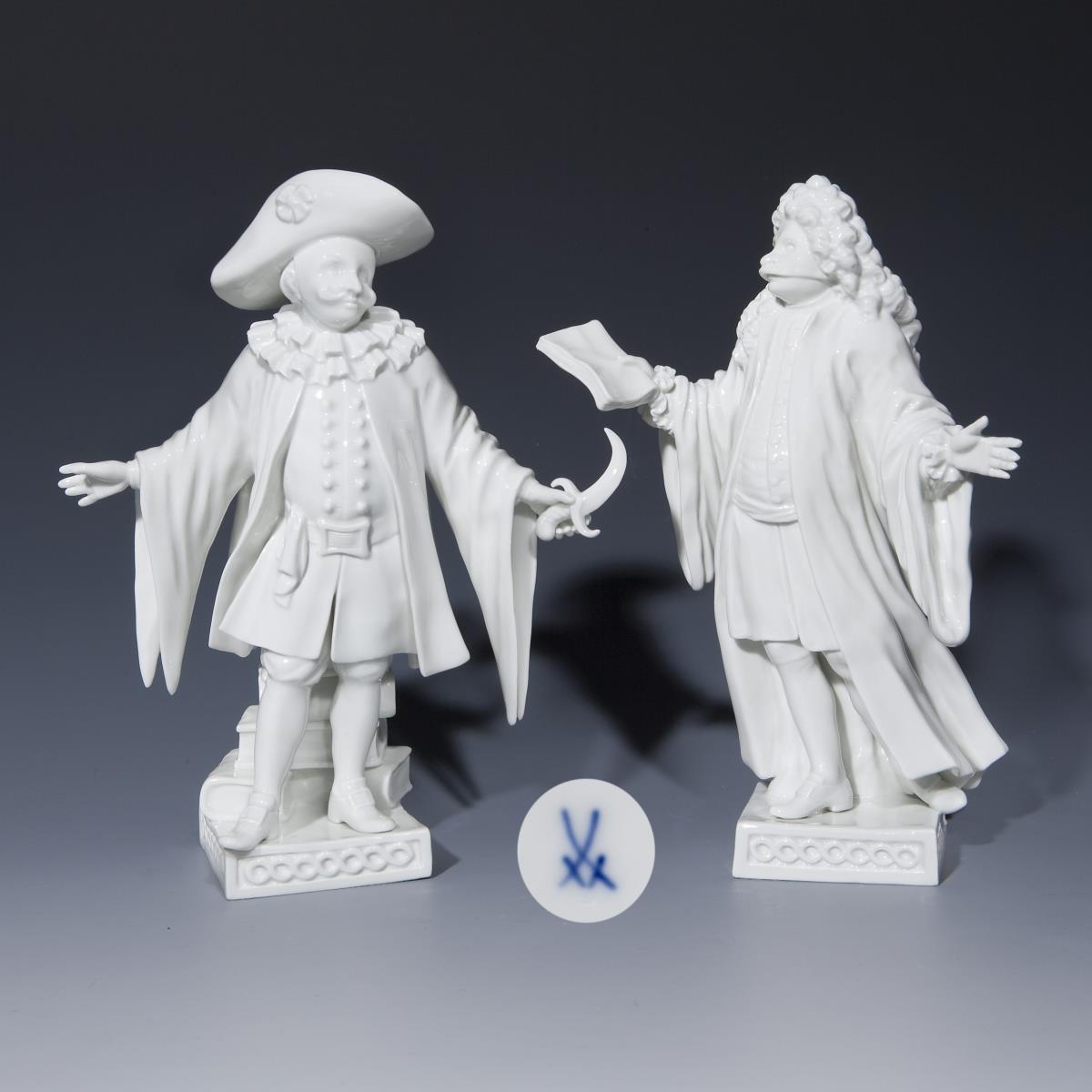 Modell von Johann Joachim Kaendler 1772-1775. "Dottore" und "Advokato" aus der Commedia dell'arte (aus einer Serie von 14 Figuren). Weißporzellan. Pressmarken, Schwertermarken einmal gestrichen.