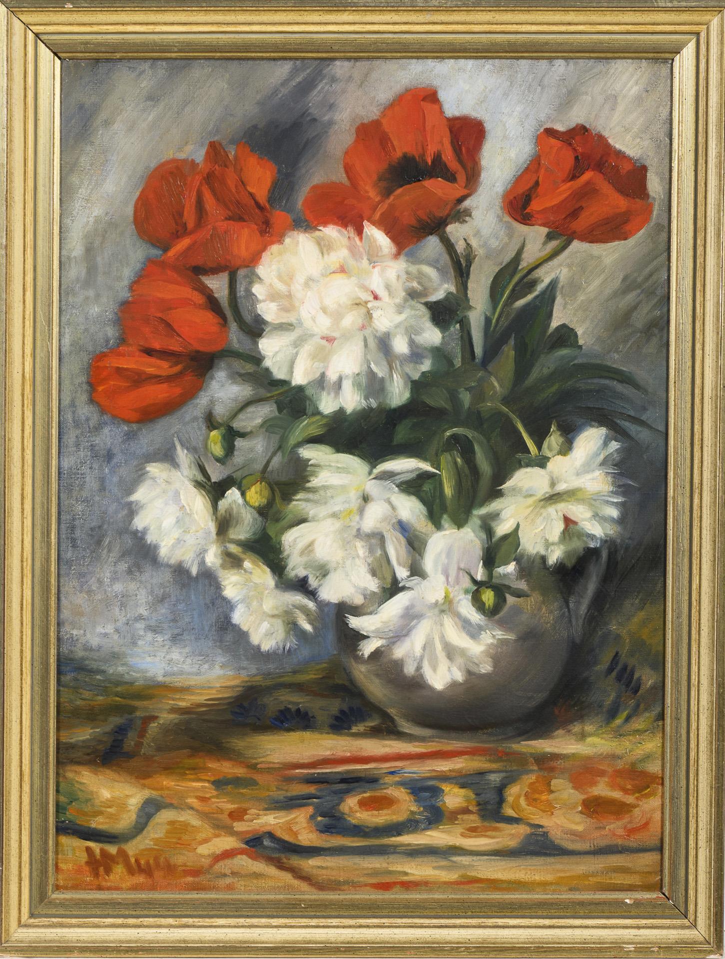 Poppies next to peonies in a vase in bright light. One small restored area with backing.