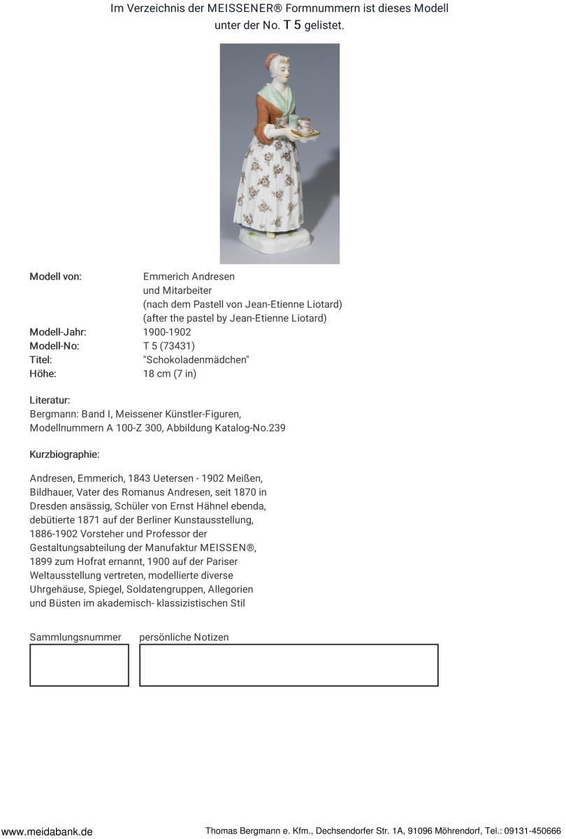 Modell nach dem Pastell um 1745 von Jean-Etienne Liotard. In Meissen um 1900 modelliert. Farbig bemalt, gold staffiert. Ritzmarke, Pressmarke, Malermarke, Schwertermarke mit Punkt 1. Wahl.