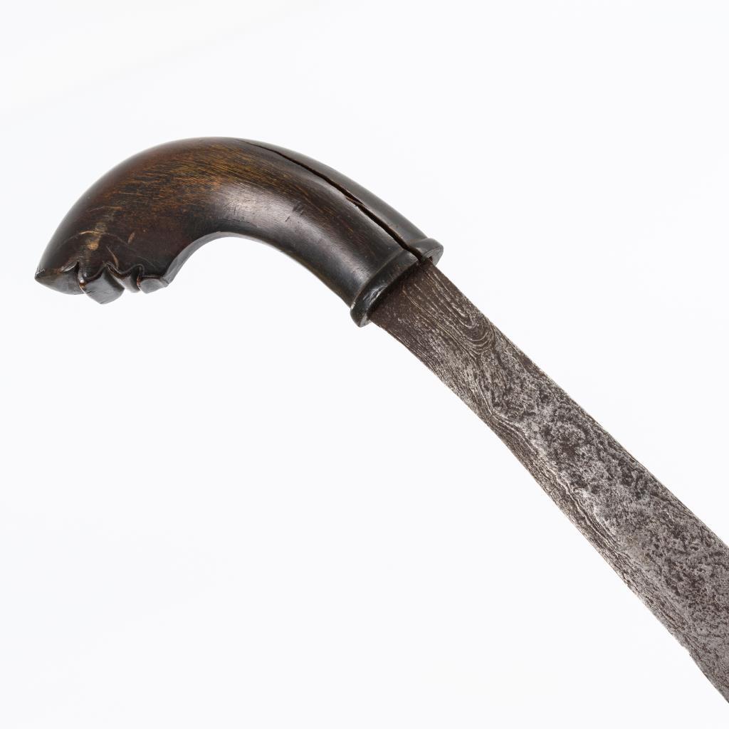 Machetenartige Klinge mit pamor, abgewinkelter Holzgriff. Leichte Holzscheide.