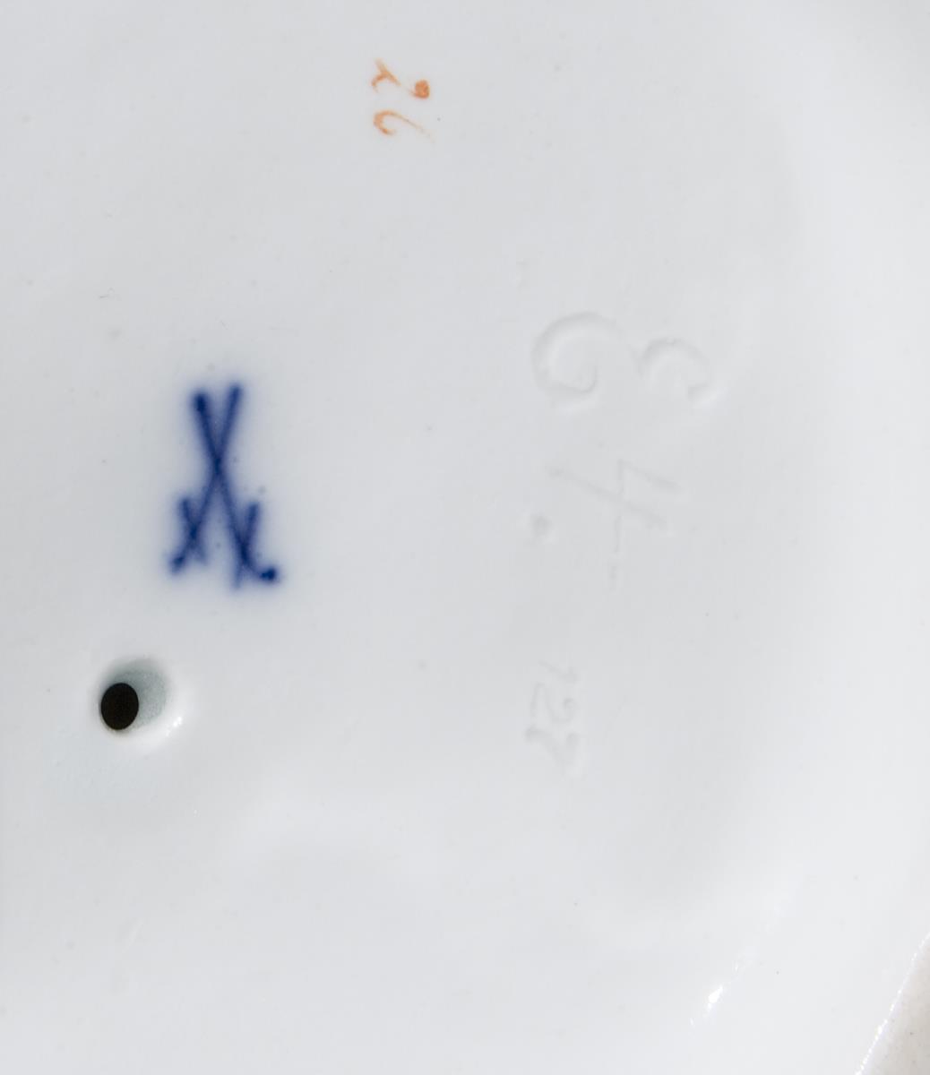 Modell von Johann Carl Schönheit 1772. Aus einer Serie "Die fünf Sinne". Farbig bemalt, gold staffiert. Ritzmarke, Pressmarke, Malermarke, Schwertermarke 1. Wahl.