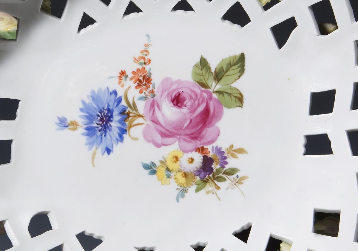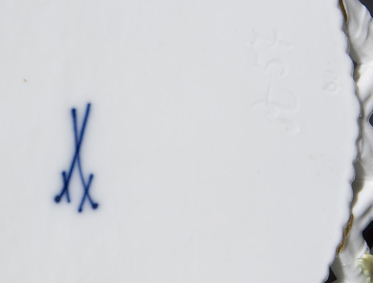 Modell von Johann Joachim Kaendler 1764-1766. Beidseits farbige florale Bemalung, Goldstaffage. Umlaufend plastisch aufgelegte, naturalistisch bemalte Blütenzweige. Durchbrochen gearbeiteter reliefierter Korpus auf vier Astfüßen, aus denen seitlich Henkel wachsen. Ritzmarke, Pressmarke, Schwertermarke 1. Wahl.