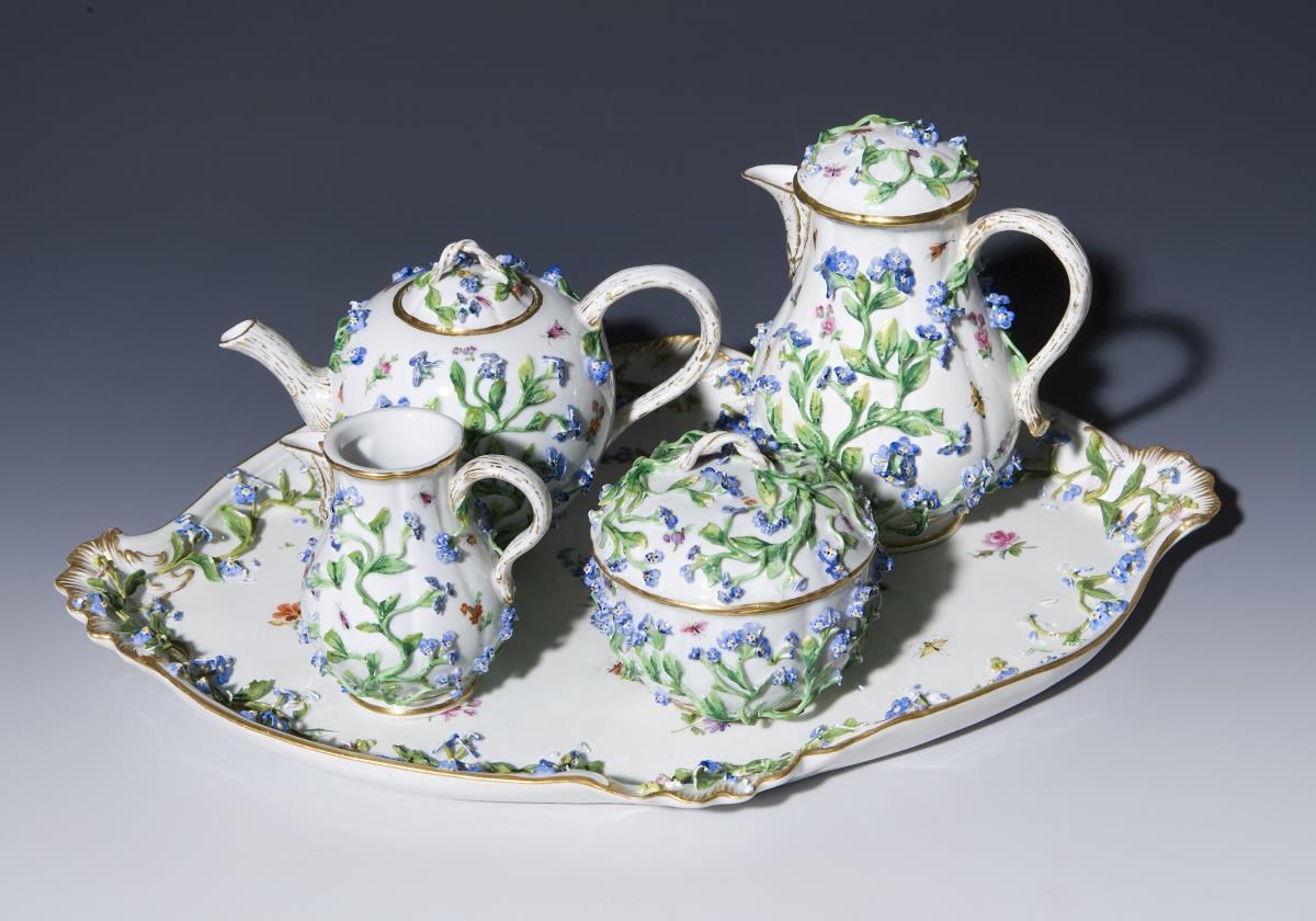 5-Teile: Tablett, Kaffeekanne, Teekanne, Milchkanne, Zuckerdose. Farbige Bemalung mit Einzelblüten und Insekten. Im Tablett-Fond Vergissmeinnichtblüten-Strauß, Goldstaffage. Allseits plastisch aufgelegte, naturalistisch bemalte Vergissmeinnicht-Blütenzweige. Ritzmarken, Schwertermarken 1. Wahl.