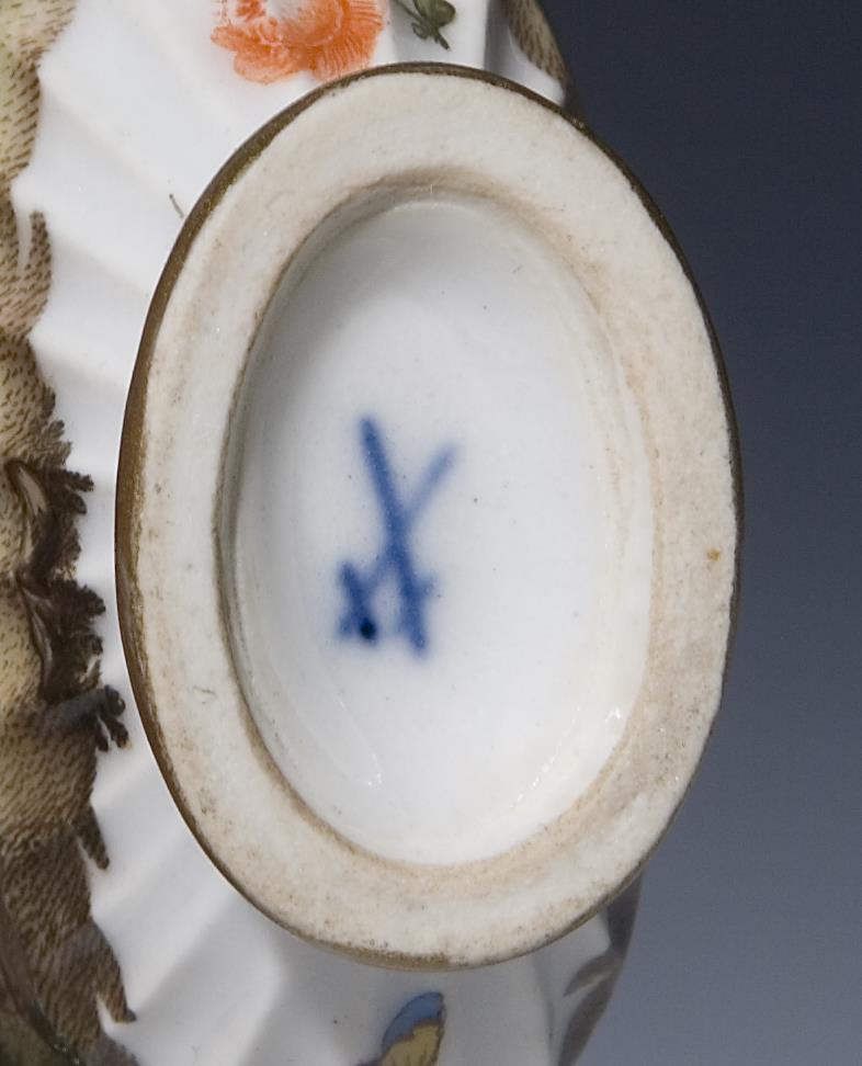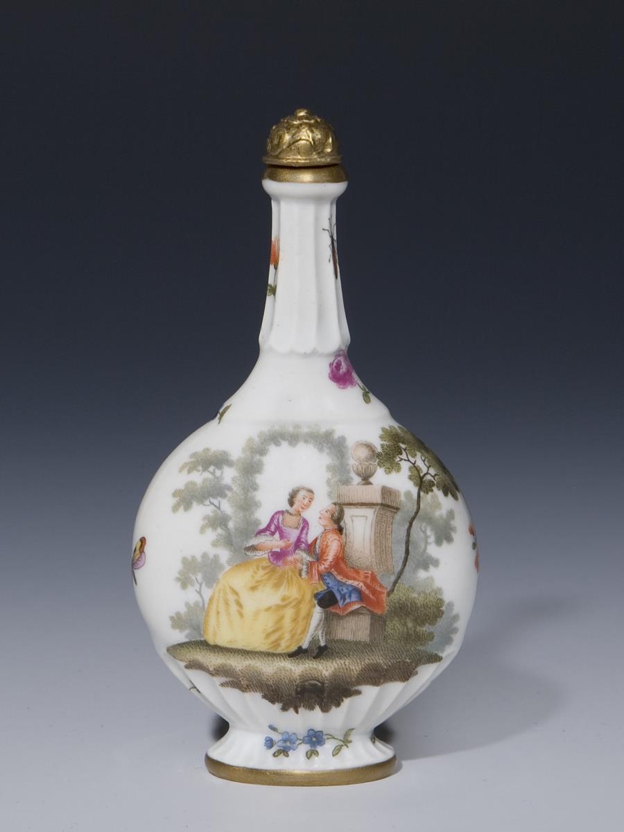 Miniatur in Form einer Pilgerflasche nach einem Meissen-Modell. Partiell godroniert. Umlaufend farbige Bemalung, zwischen Blumen und Insekten beidseits galante Paare in Parklandschaften. Gold staffiert. Metall-Stöpsel. Blaue Schwertermarke.