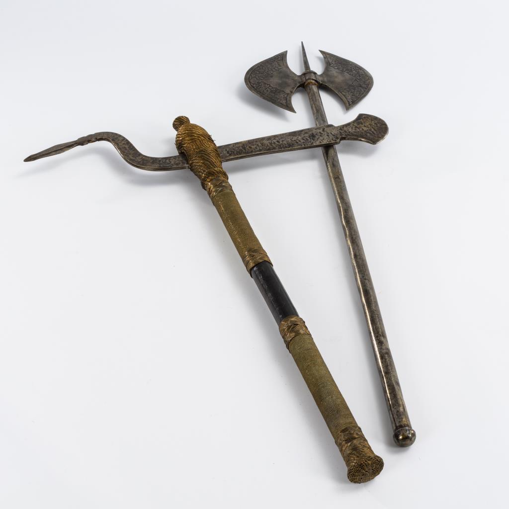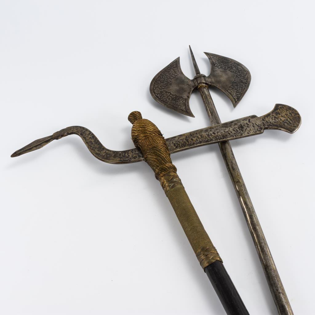 Zierhellebarde mit Eisenschaft. Geätztes Rankenmuster auf den halbrunden Flächen. / Streitaxt (?) mit geschärfter Klinge. Holzschaft aufwändig mit Drahtgeflecht umsponnen.