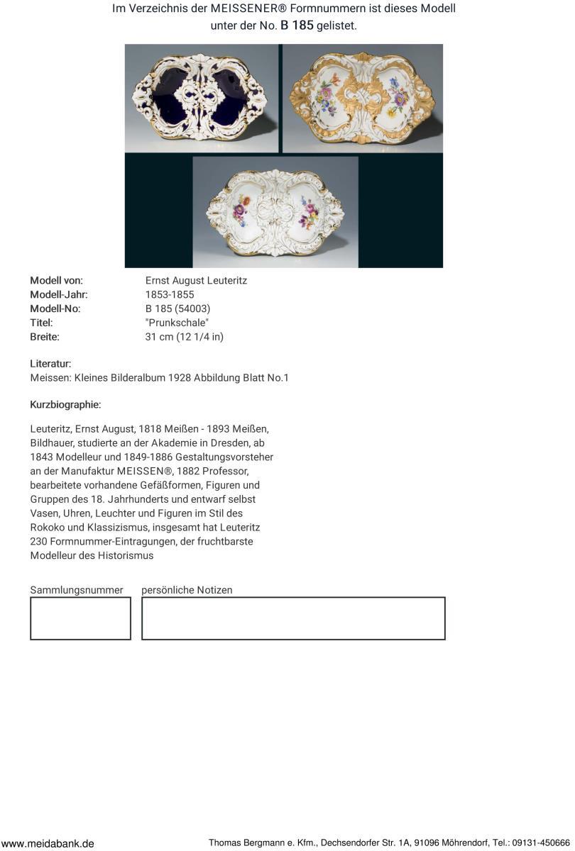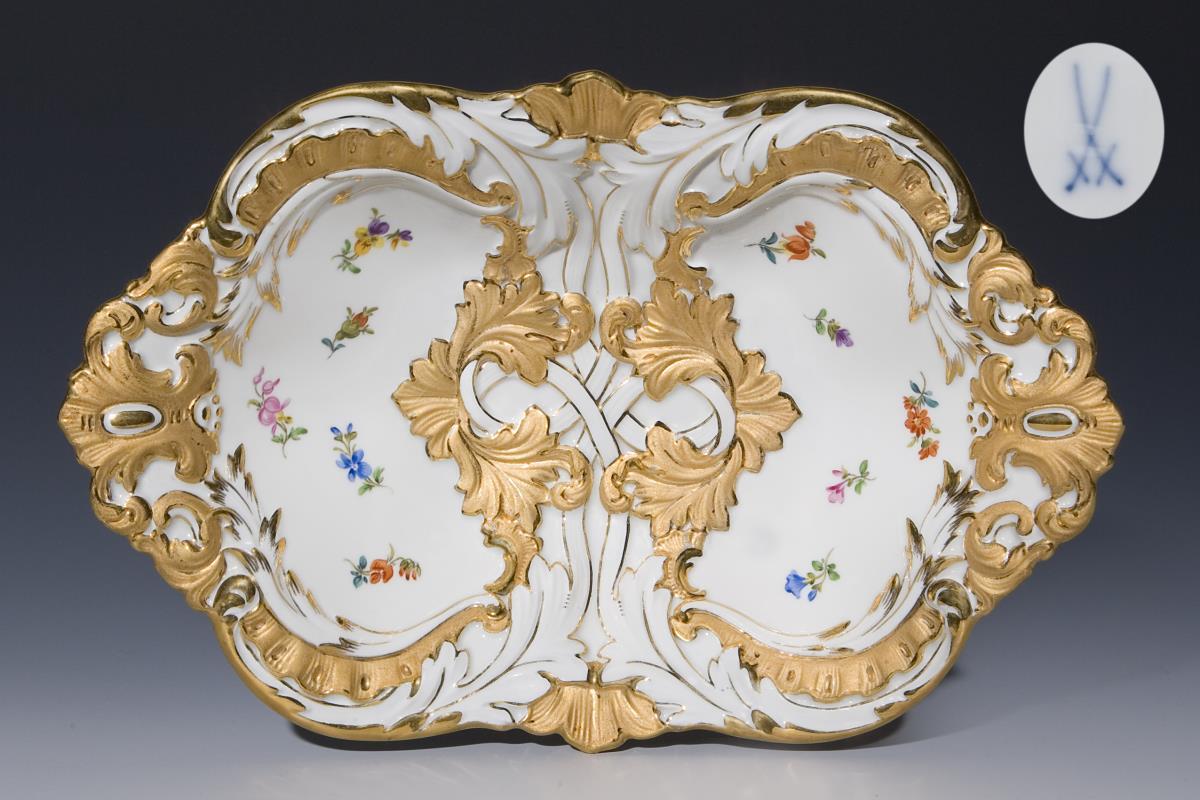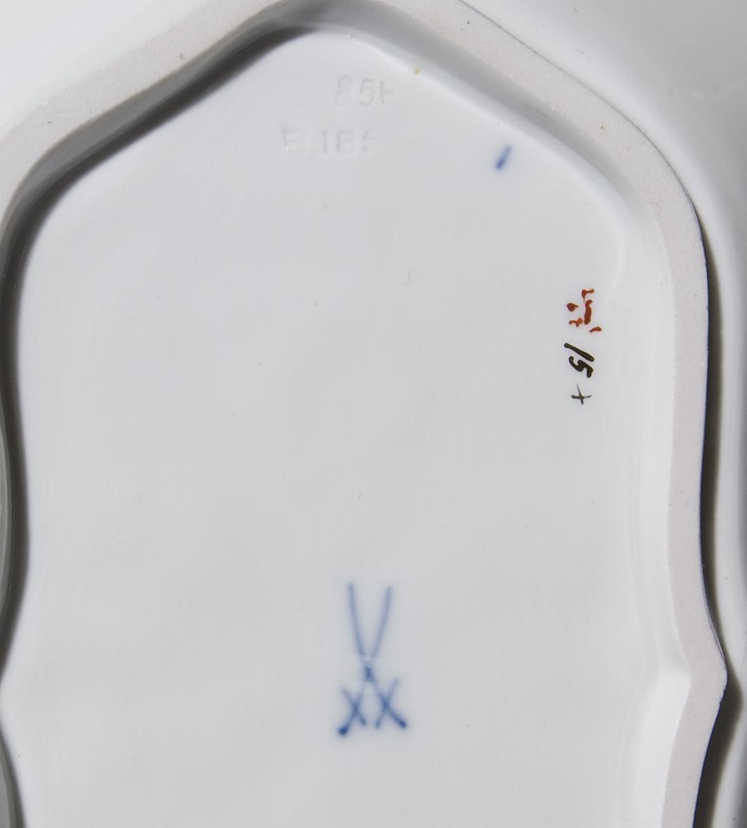 Reliefiert, gold staffiert, mattiert und poliert. Farbig bemalt "Streublumendekor". Pressmarke, Malermarke, Schwertermarke zweimal gestrichen.
