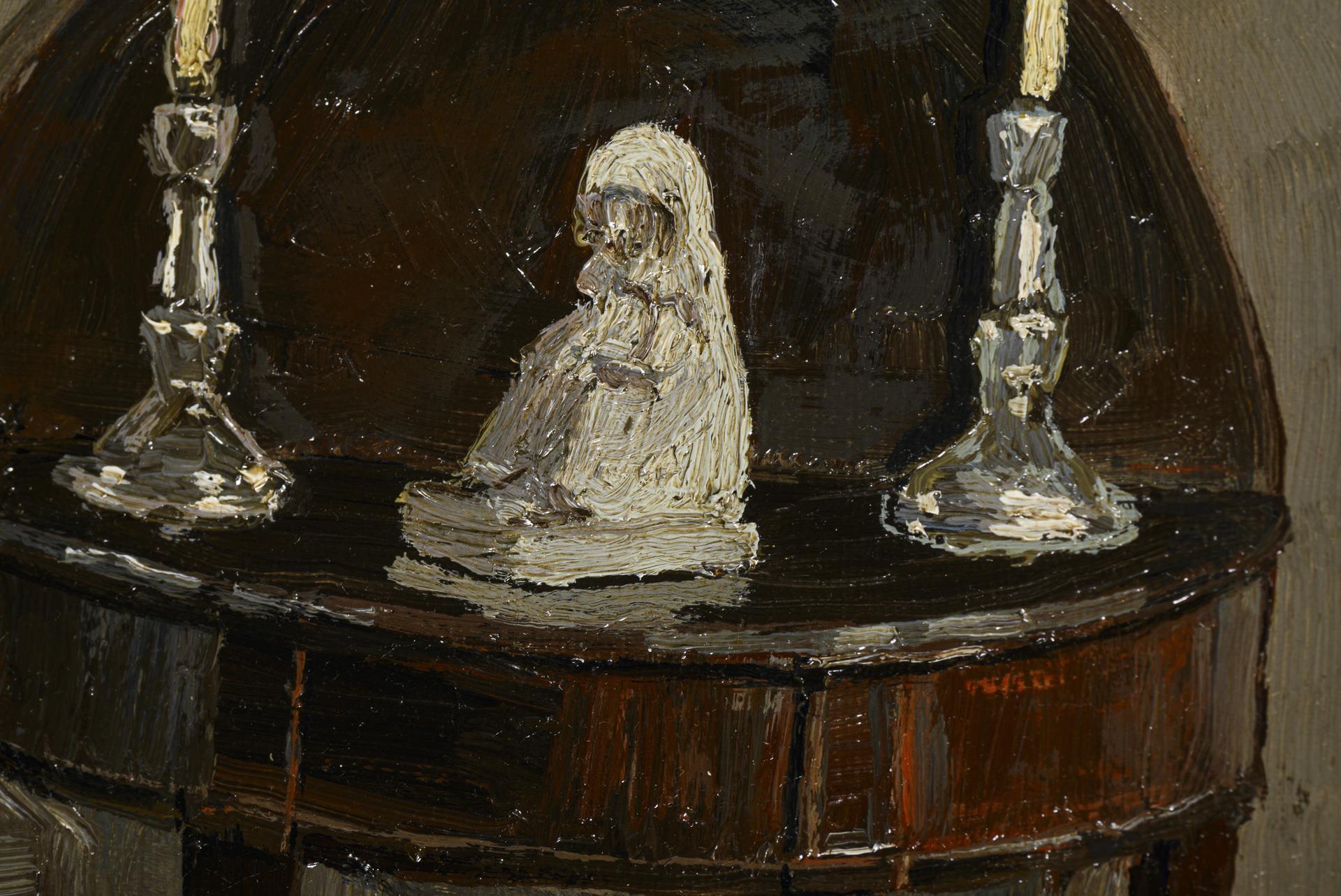 Bourgeois parlor with a painting above a semicircular table with chandeliers and porcelain figure.