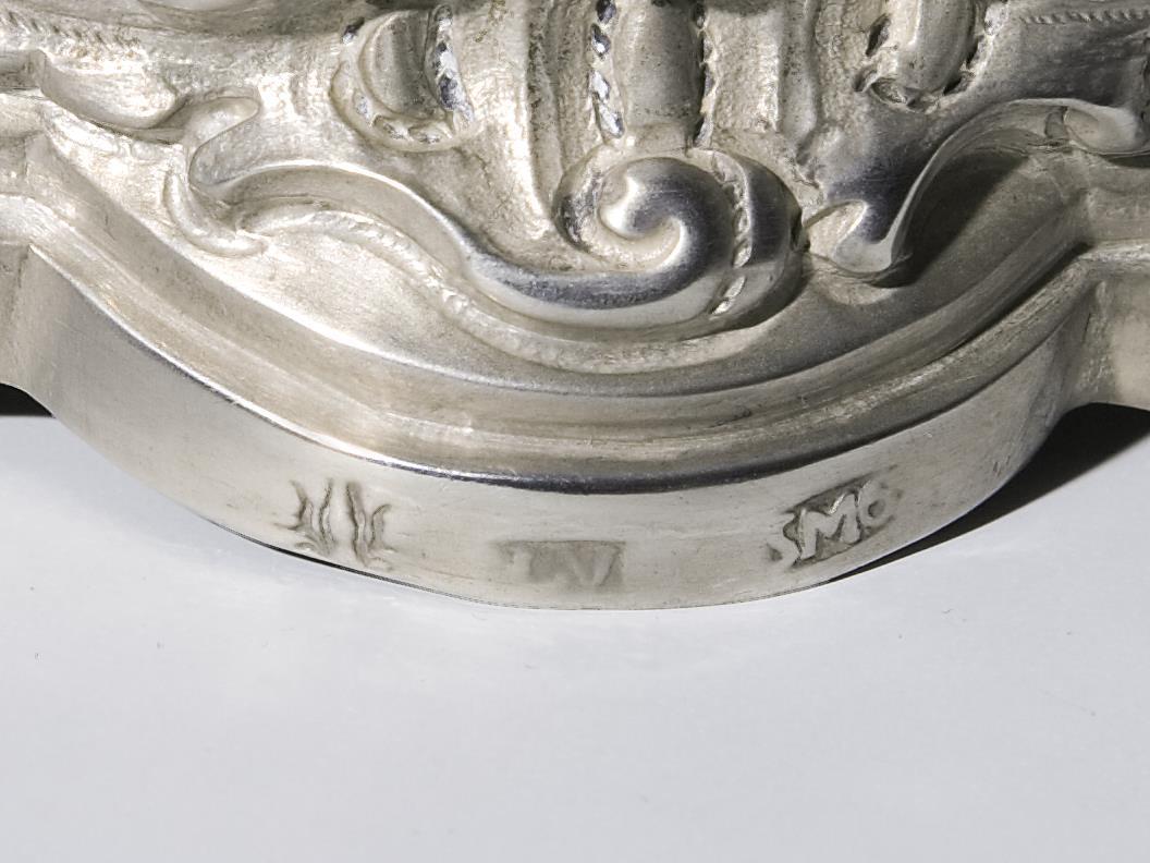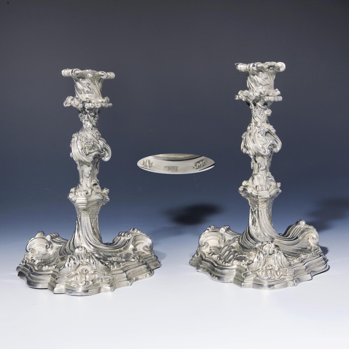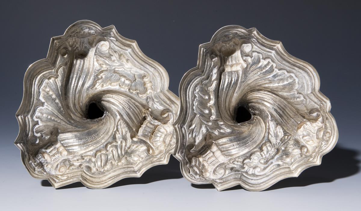 Silber, gegossen, massiv gearbeitet. Floral und ornamental reliefiert. 1-flammige Standleuchter im Barock-Stil. Umlaufend Blüten-, Blatt-, Rocaillen- und Muscheldekor. Undeutliche Punzen.