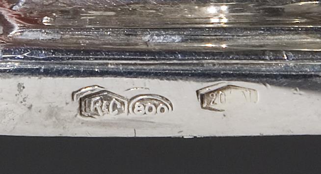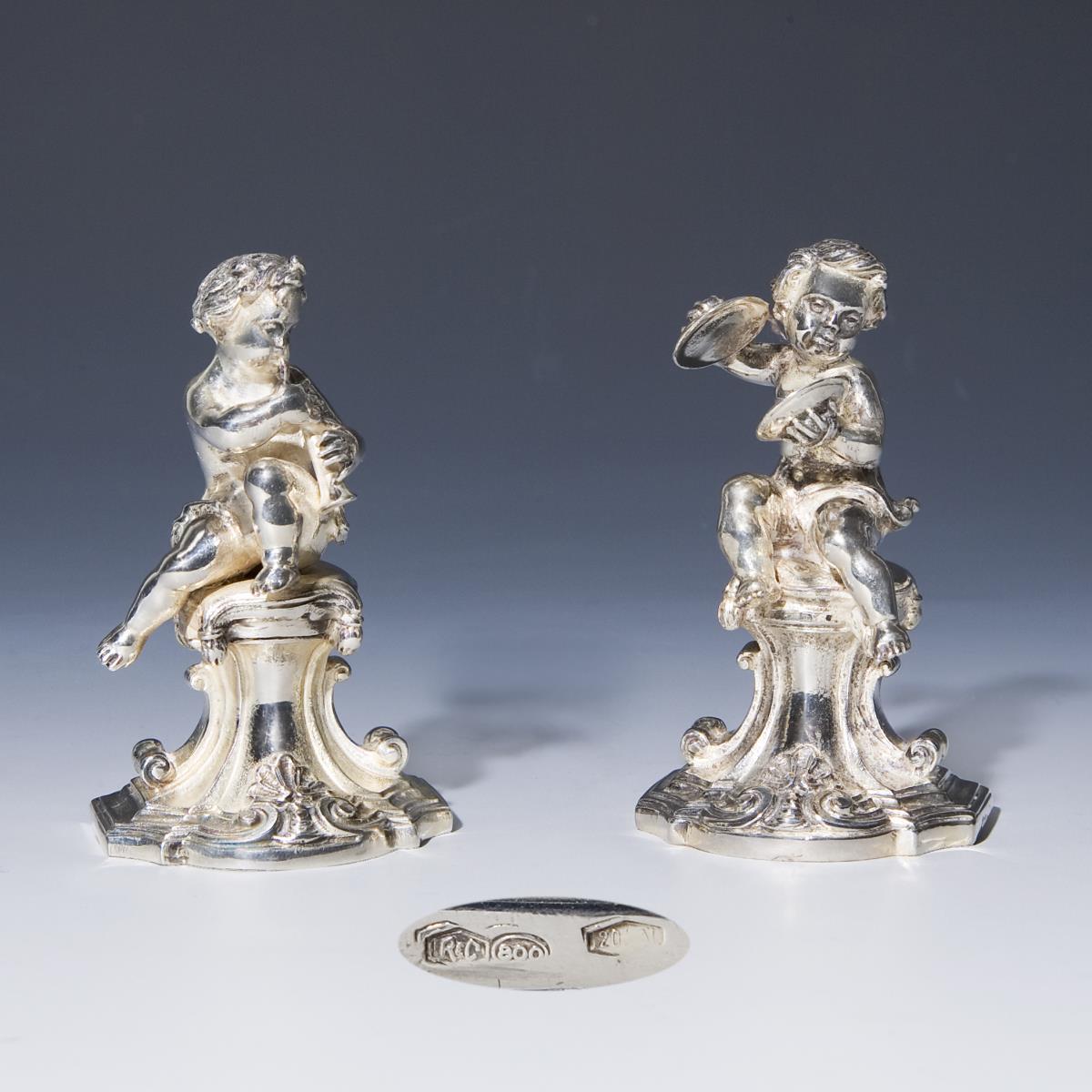 Gegossen, massiv gearbeitet. Vollplastische Figuren im Barock-Stil. Punzen mit Firmenstempel und Feingehalt.