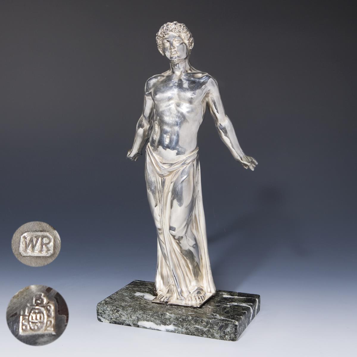 Männlicher Halbakt. Datiert, hohl gearbeitet. Vollplastische barfüßige Figur in Stand- und Spielbeinhaltung mit athletischem Oberkörper. In ein um die Hüften geschlungenes bodenlanges Tuch gehüllt. Montierte Marmor-Plinthe. Punzen mit Stadtmarke, Feingehalt und Meistermarke.