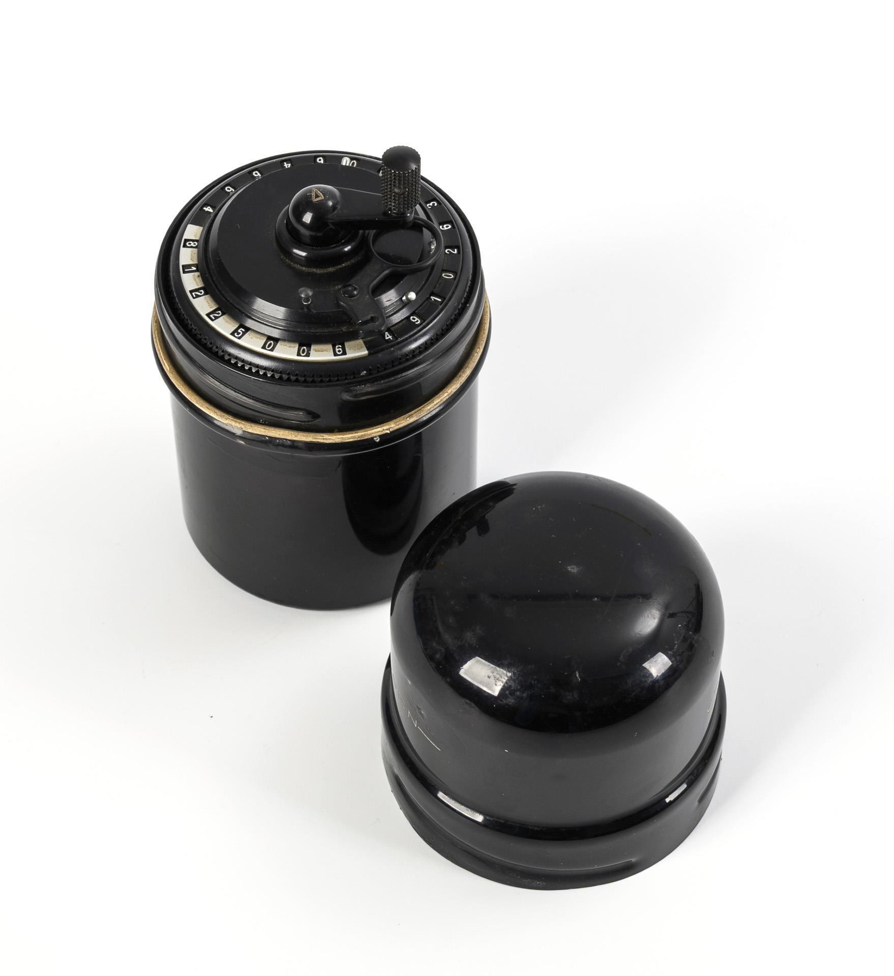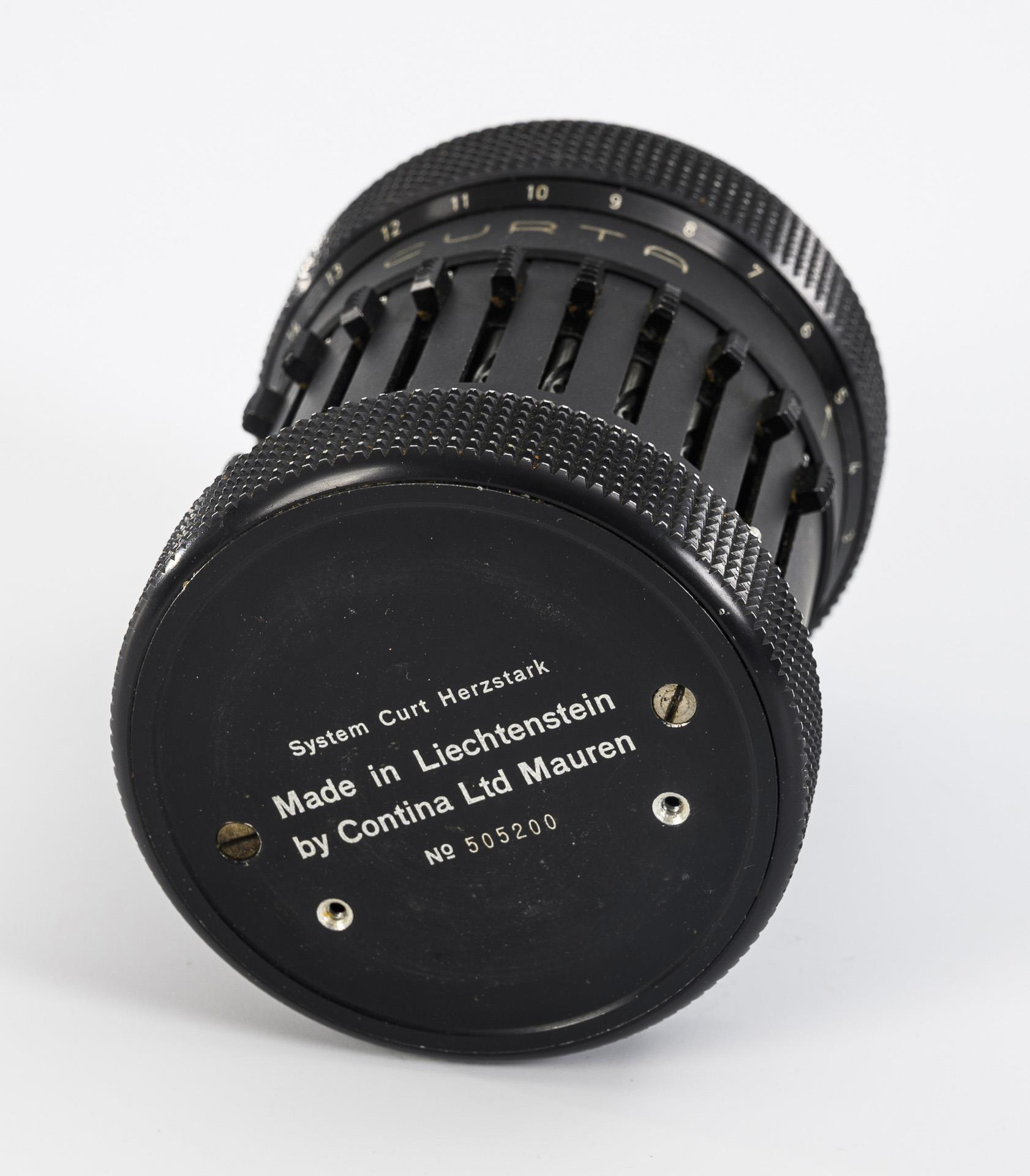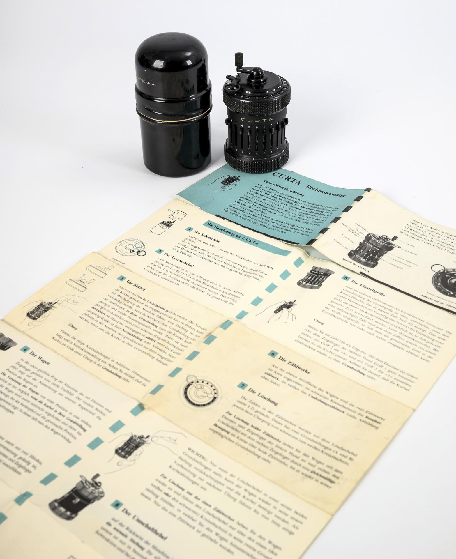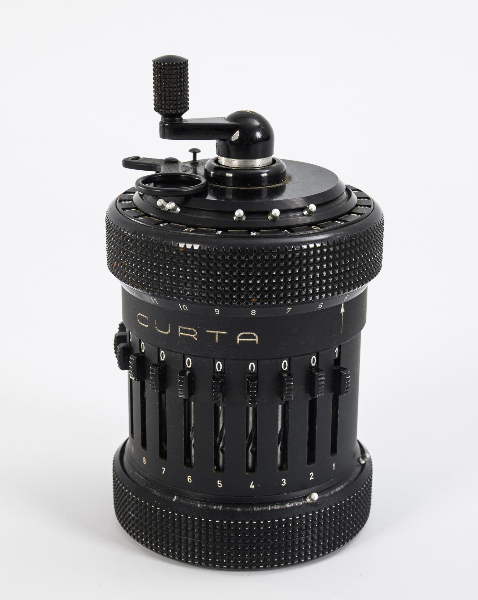Mechanical calculating machine operated by graduated rollers. The principle underlying the calculating machine was patented by the Austrian inventor Curt Herzstark in 1938 and he was able to have his invention built by Contina AG in Liechtenstein in 1947 after the end of the Second World War and liberation from the Buchenwald concentration camp. The CURTA, named after its inventor, is capable of the four basic arithmetic operations, can take square roots and operates in a number range of up to 11 digits. Some signs of age and use on the metal case, with a few dents and some restored paint damage, especially on the lid.