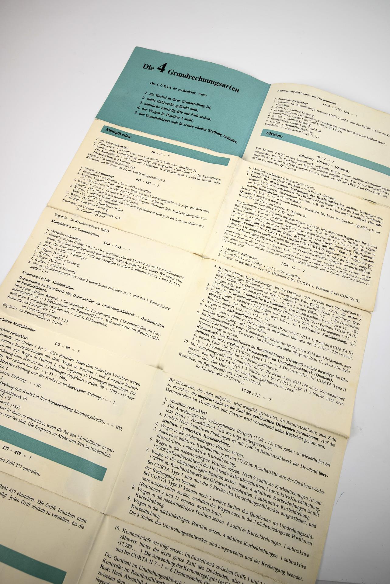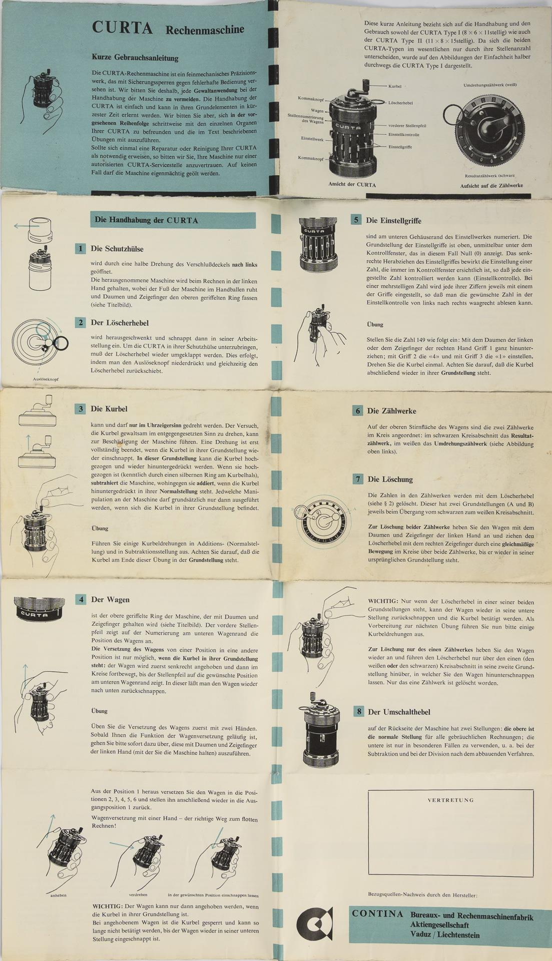 Inscribed on the underside "System Curt Herzstark Made in Liechtenstein by Contina Ltd Mautren" and the production number 505200. Enclosed are operating instructions and a modern information sheet.