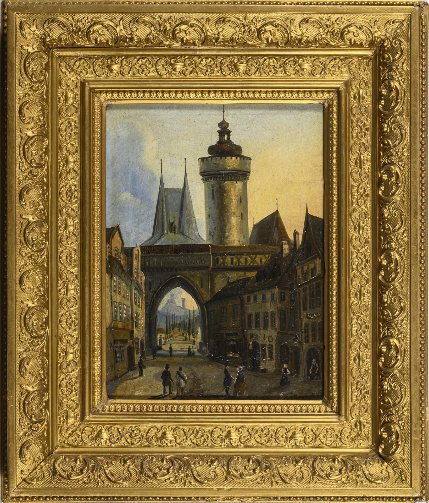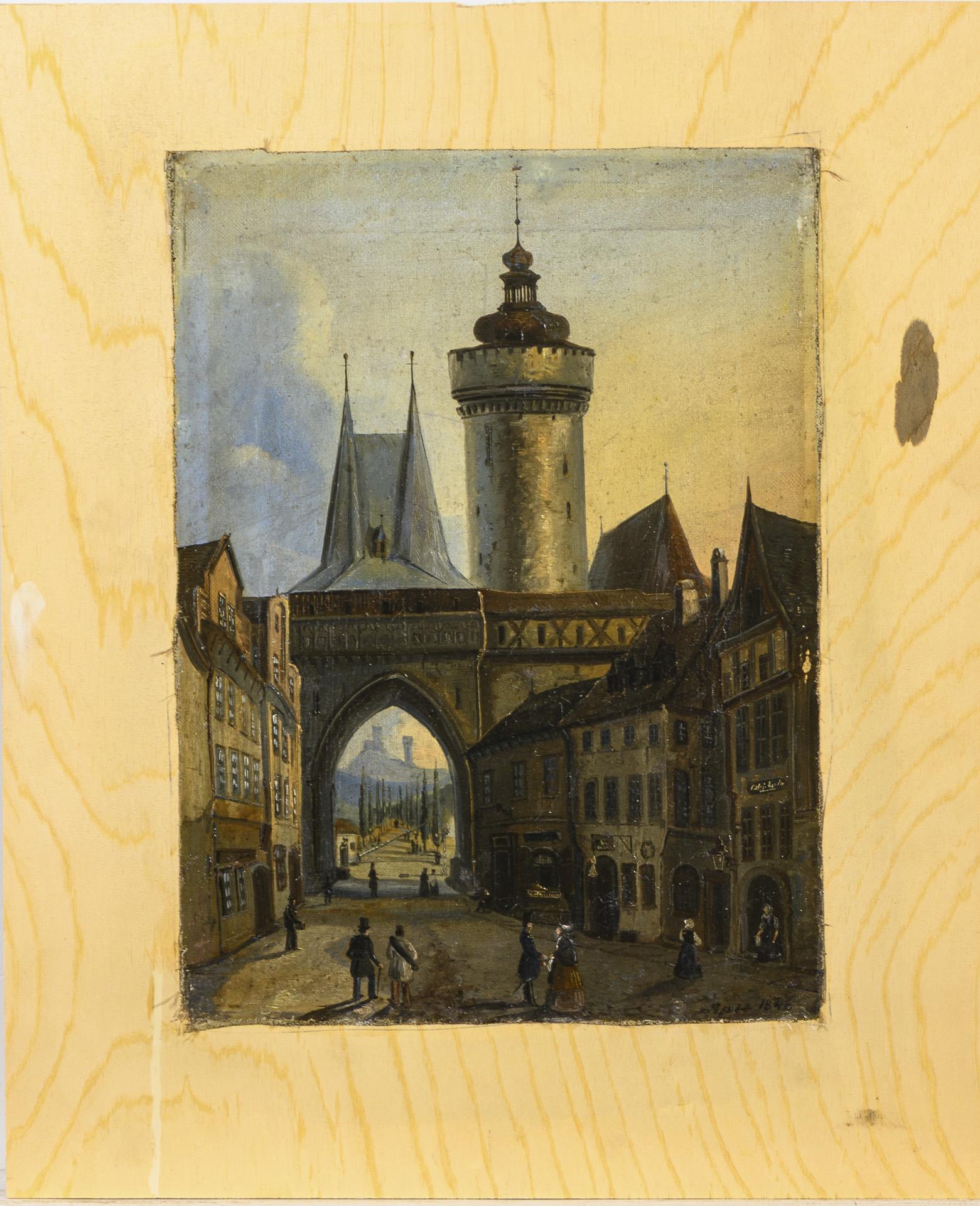 Several people on the street in front of the gatehouse on a sunny day. Traces of age.
