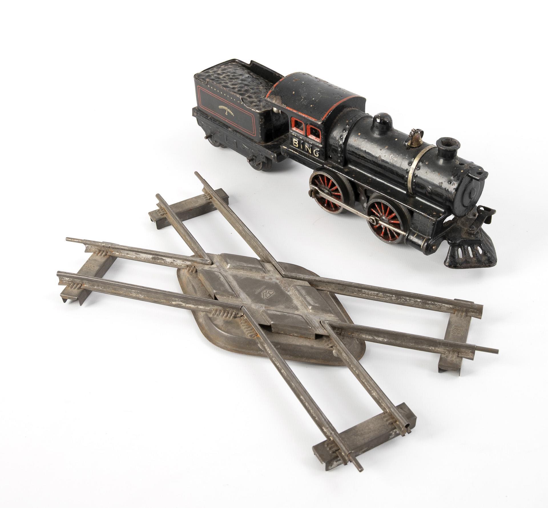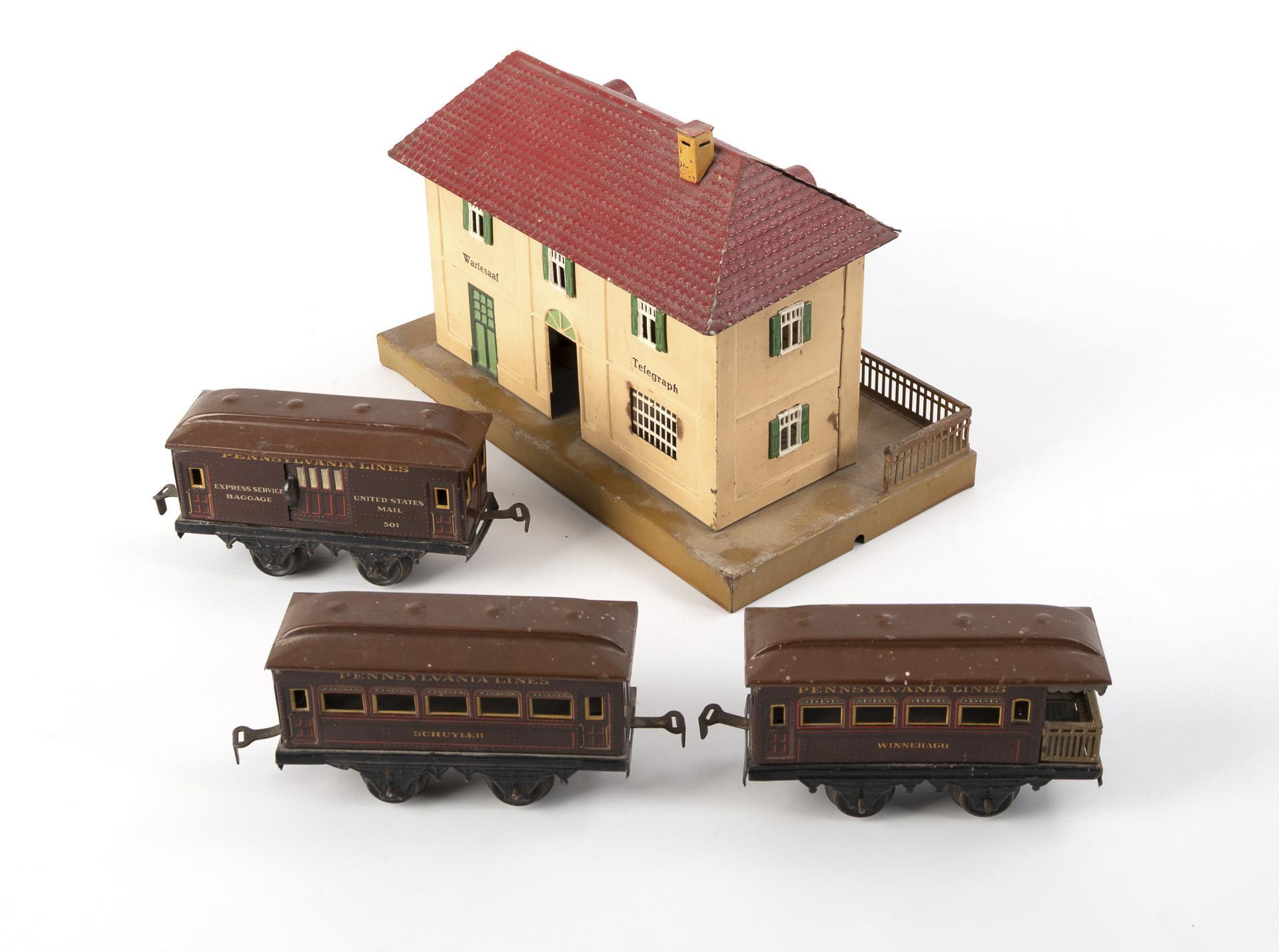 Black cast iron Bing locomotive with intact movement and key (L 19 cm). Comes with tender, 3 "Pennsylvania Lines" cars and tinplate track circle / Märklin station with dented, red tiled roof (20.5 x 29.5 x 16 cm). Used, with signs of age.
