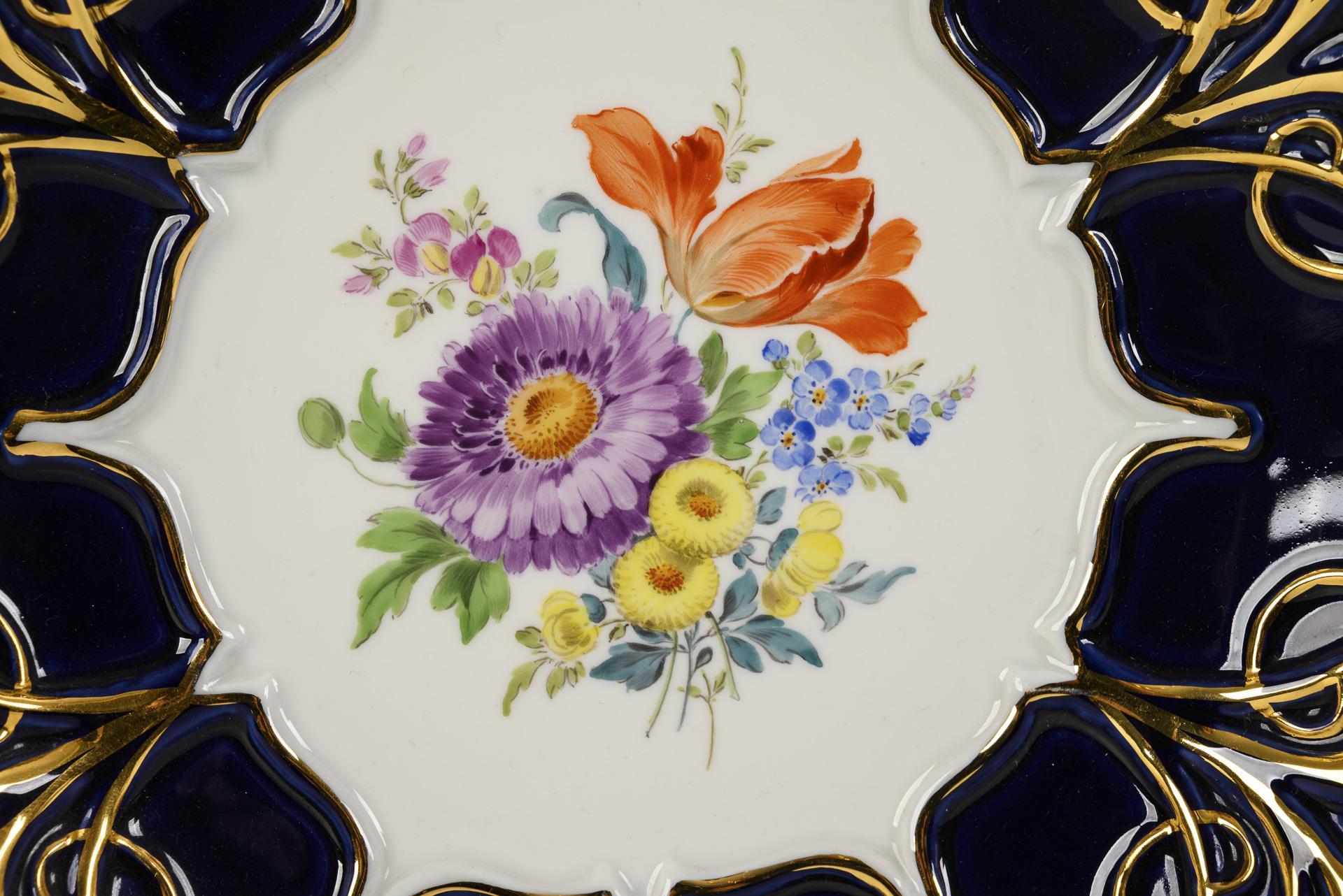 Representative dish with cobalt background and flower painting. Meissen.