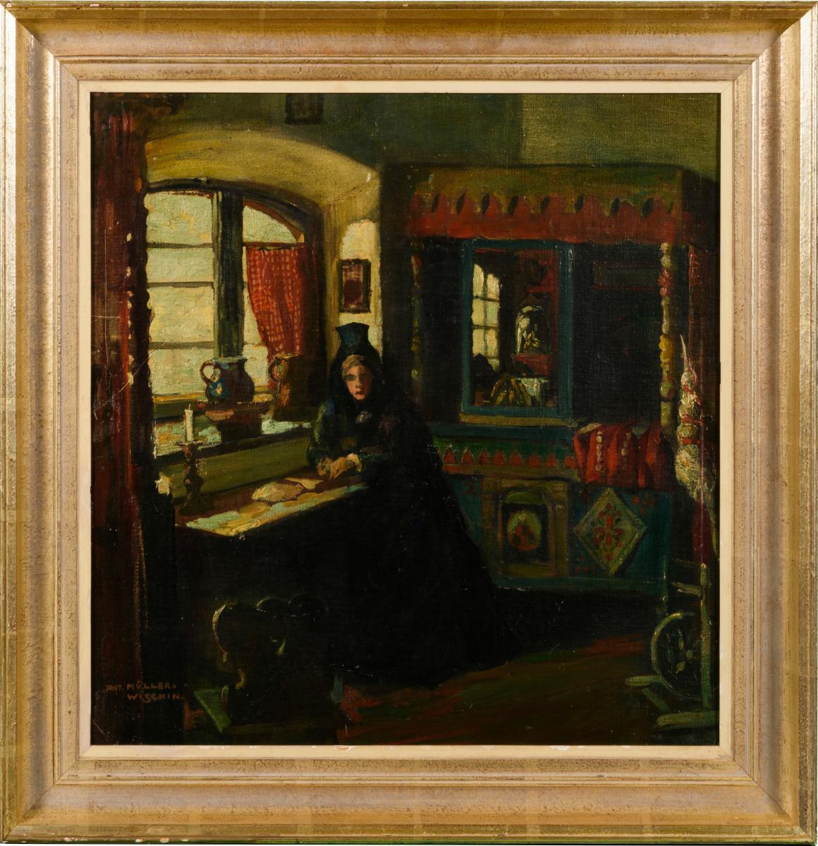 MÜLLER-WISCHIN, Anton (1865 Weißenhorn - 1949 Marquartstein) Bauernstube mit Baldachinbett Öl/Leinwand/Karton. Links unten signiert. 50 x 49 cm. Gerahmt: 64 x 62 cm. Junge Frau in Tracht in der Stube am Fenster nahe des Bettes. Landschafts-, Stillleben- und Bildnismaler in München, Autodidakt. Literatur: Thieme/Becker..