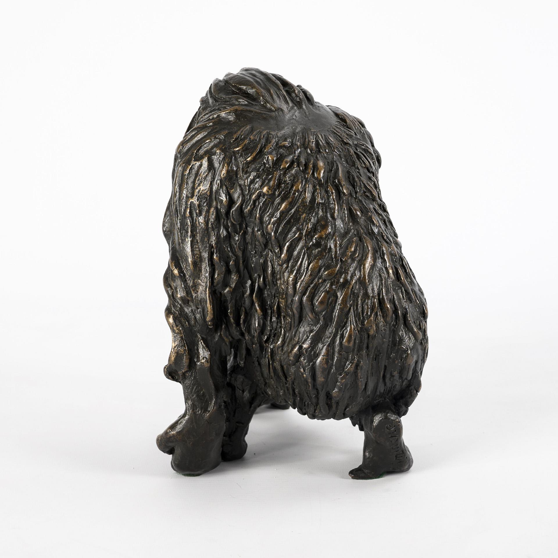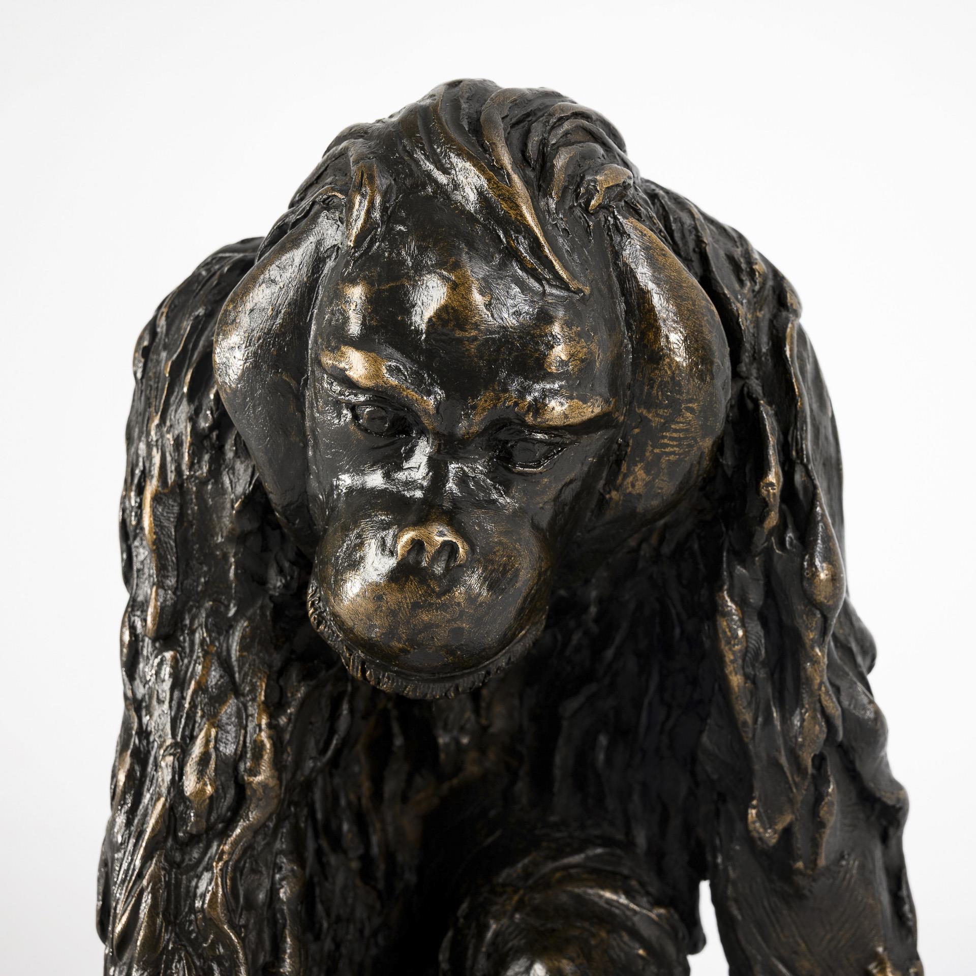 Depiction of an ape shown walking forward. Slight signs of age and wear, felt glides attached to support surfaces.