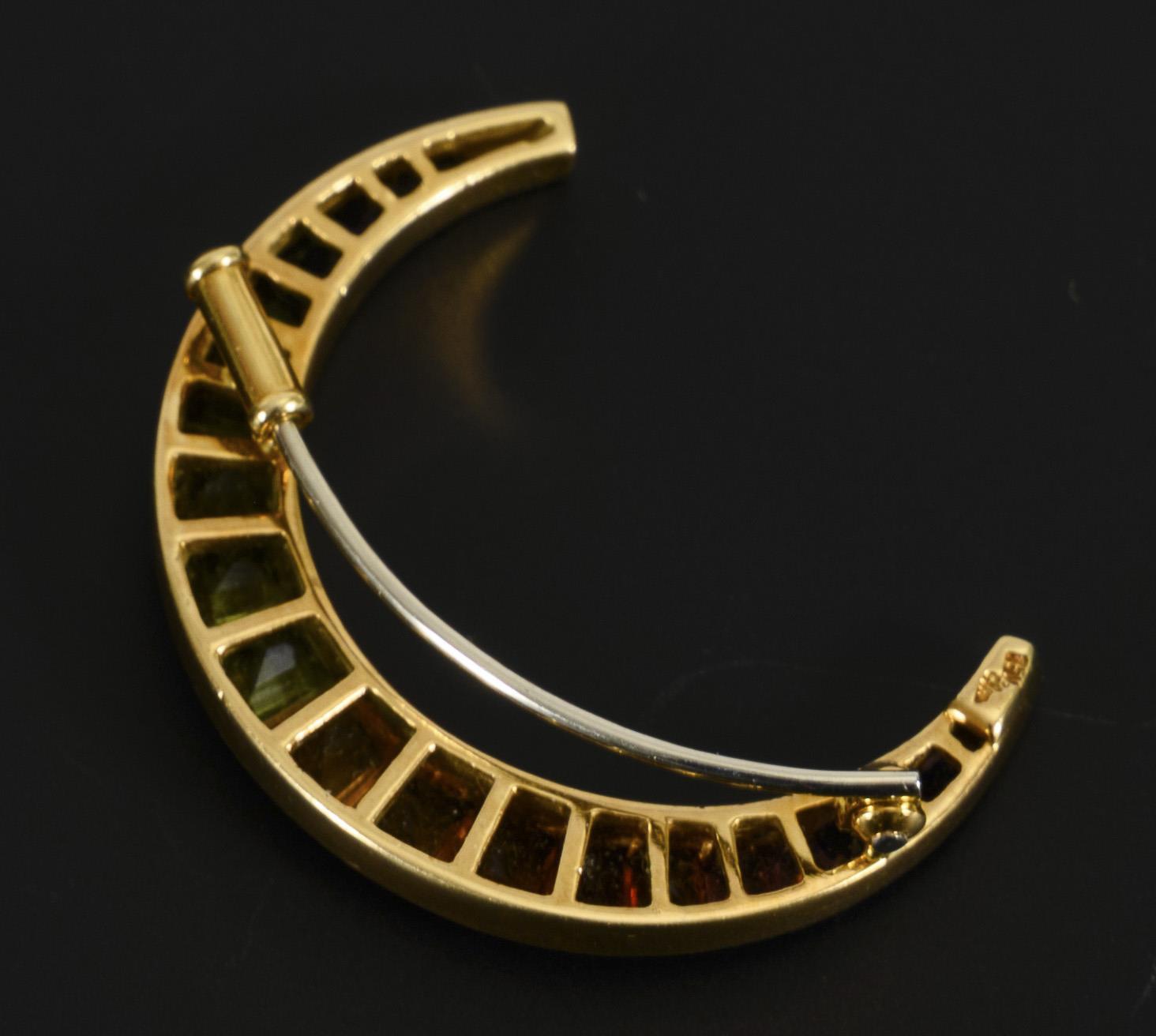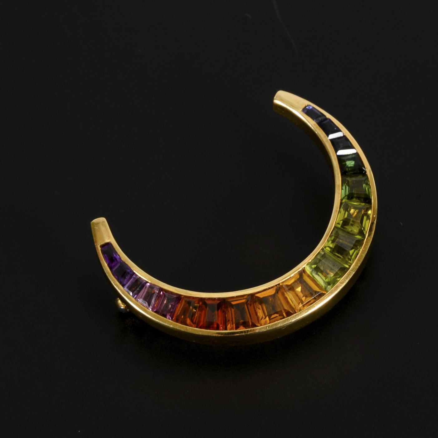 Crescent-shaped brooch with colored stones.