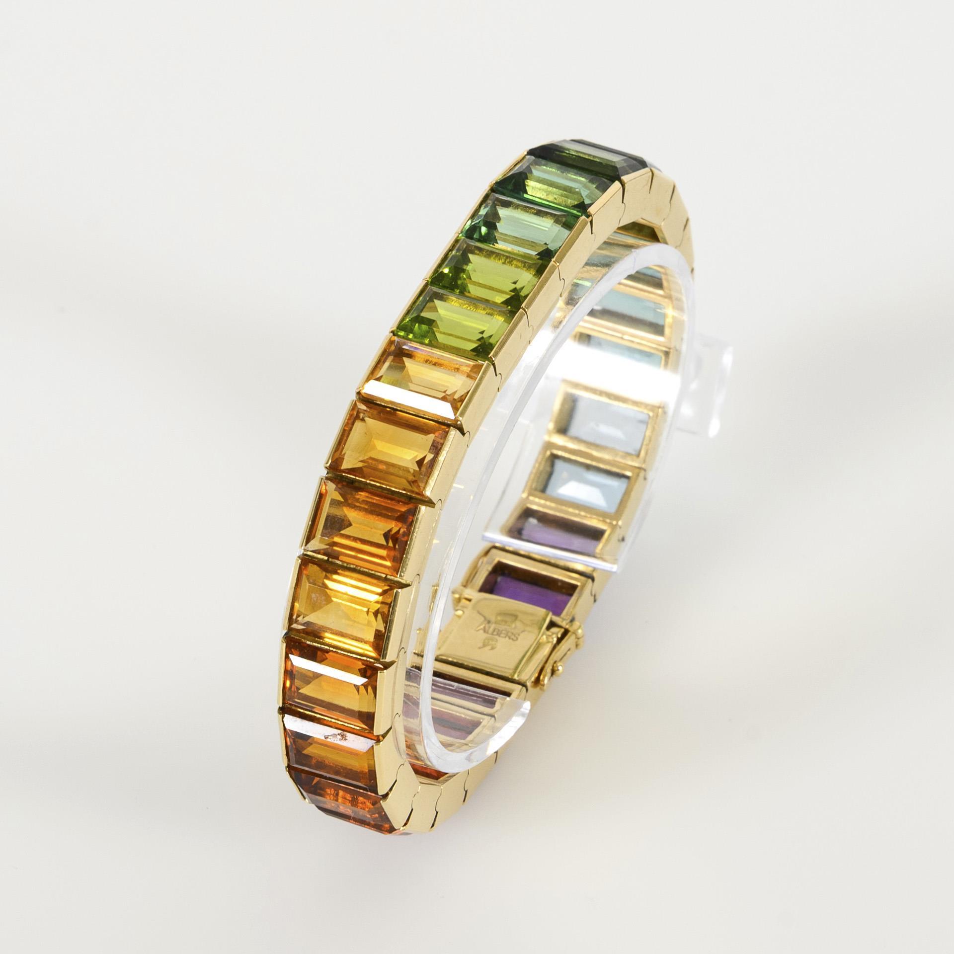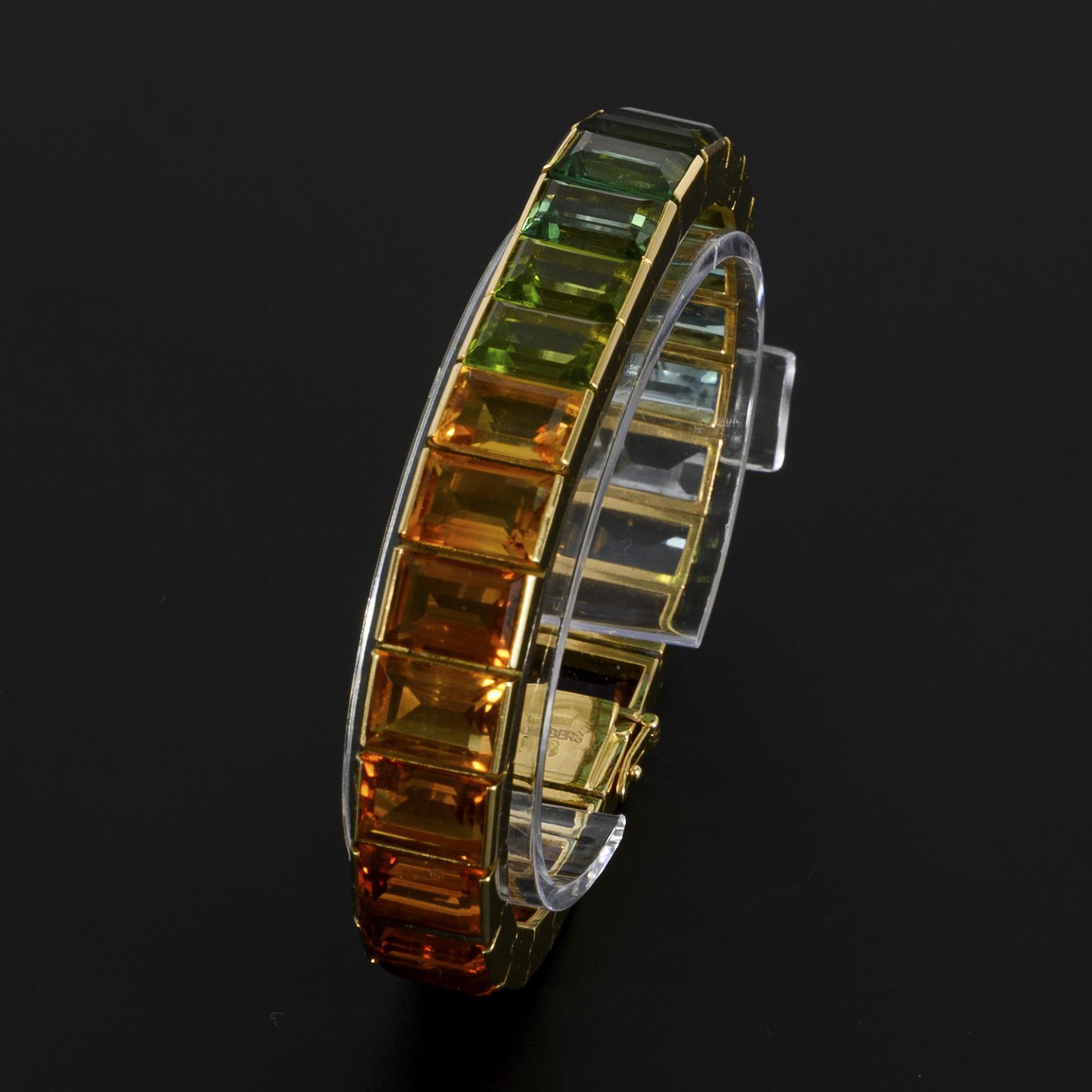 Bracelet with surrounding, color-graduated colored stone setting, each consisting of baguette-cut tourmalines, citrines, topazes, amethysts and peridots. Box lock with double figure-of-eight safety catch. Matching brooch cat. no. 168. Gold with slight signs of wear, one stone missing at the back of the clasp, this replaced with a high-quality gold plate; not visible on the front.