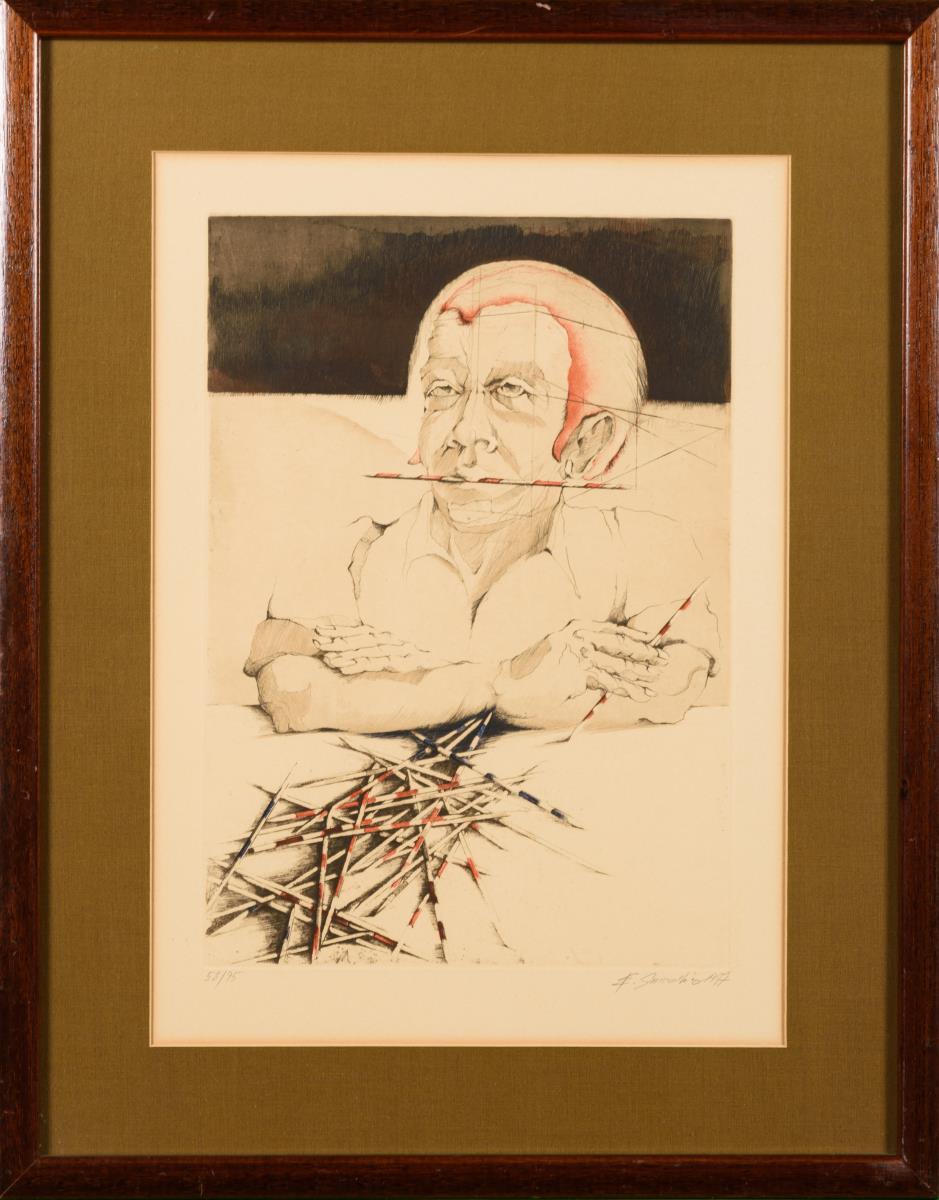 SMODICS, Erich (* 1941 Bregenz) Mikadospieler Farbradierung. Bleistiftsignatur. 1977. Exemplar: 58/95. Platte: 43 x 30 cm. Gerahmt & hinter Glas: 67 x 53 cm. . Österreichischer Maler und Mitglied des Bregenzer Kreises..
