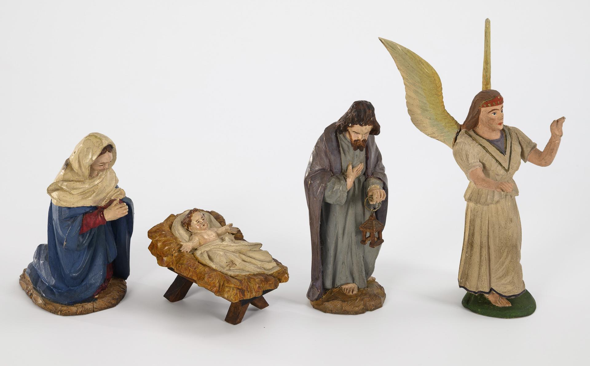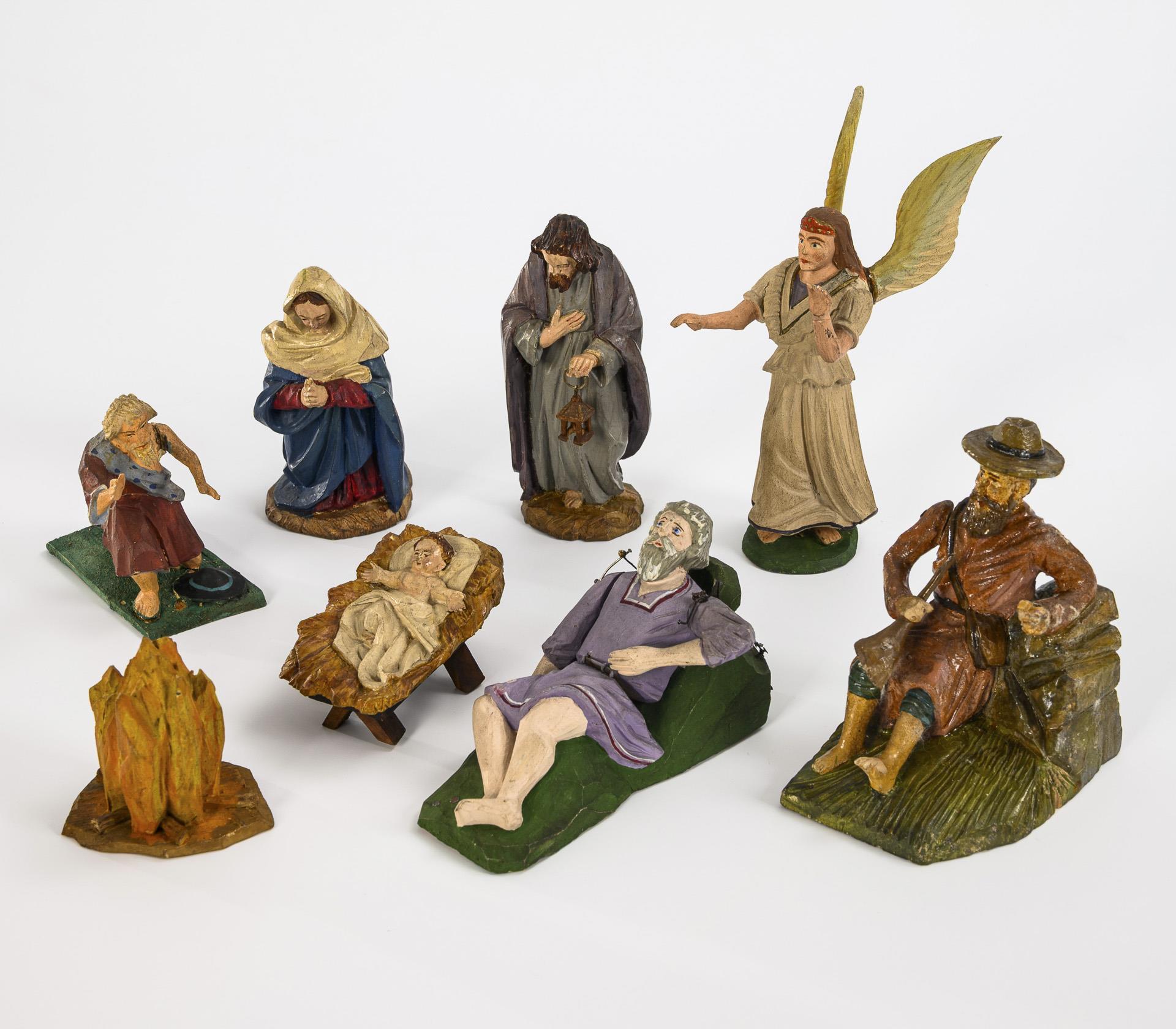 Handcrafted nativity figures from the Ore or Giant Mountains. Holy family, angel, bonfire and 3 shepherds (one of them with movable arms). Small defects and glued areas.