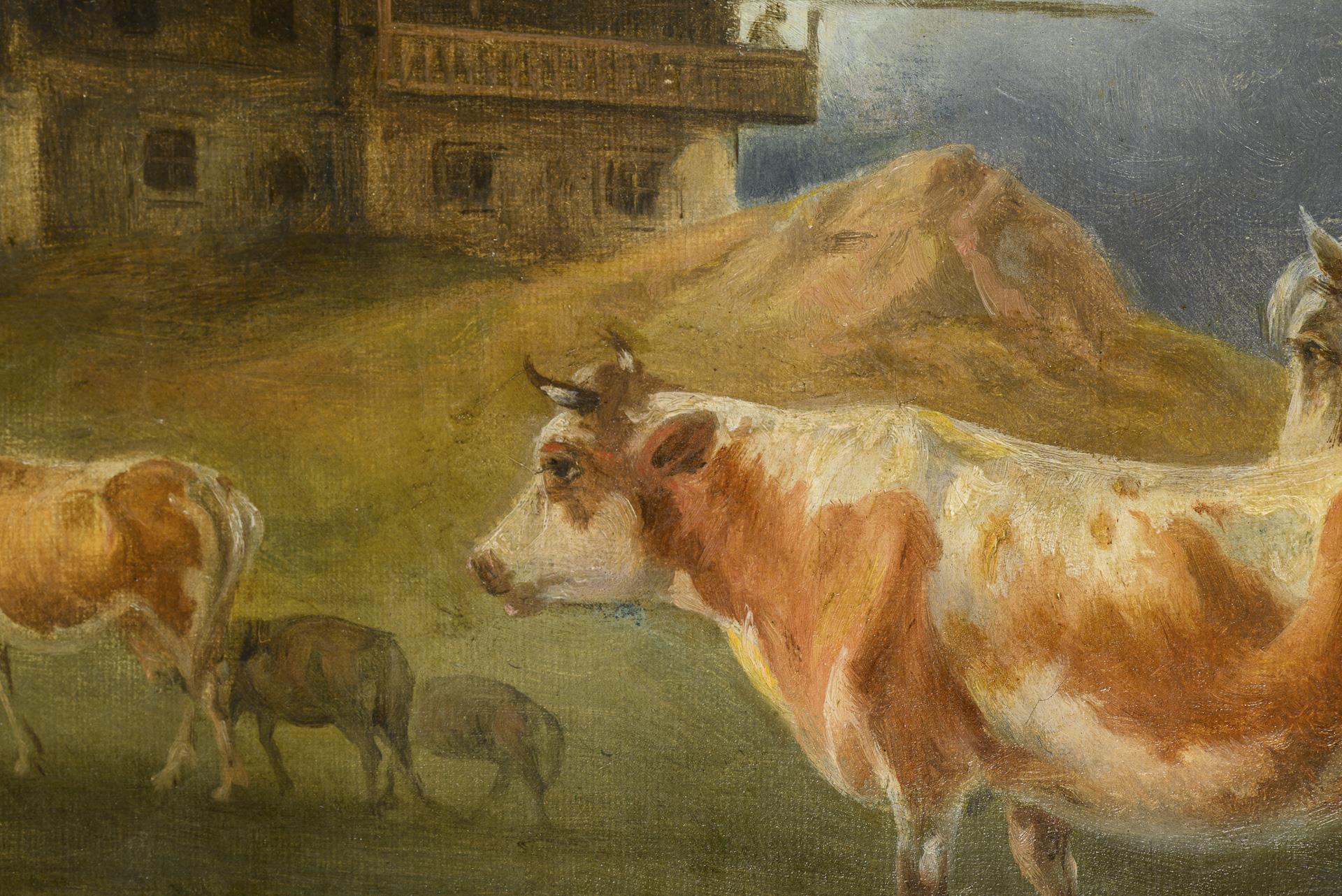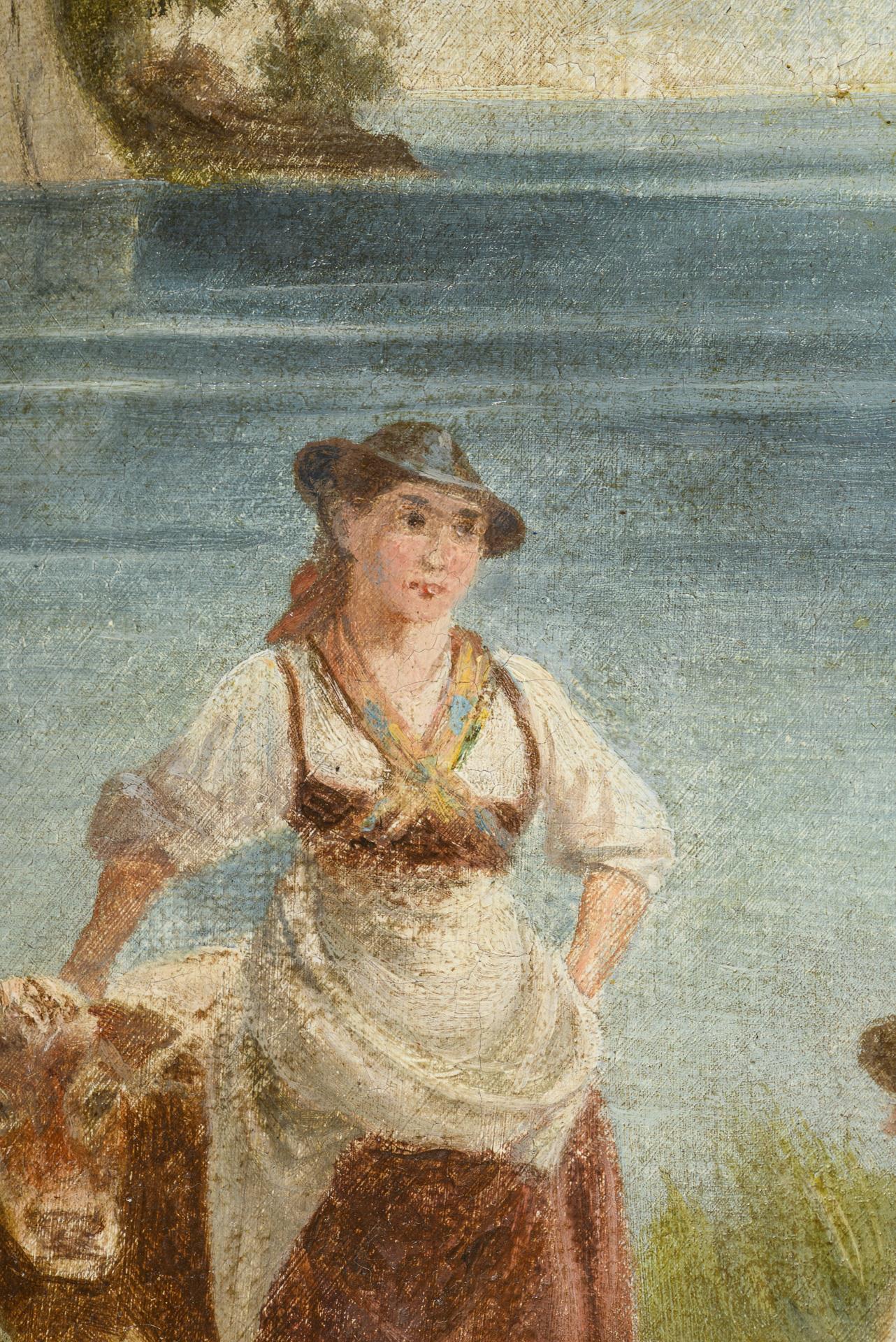 Peasant family with a herd of cattle on the shore of a mountain lake and peasant family with a herd of cattle returning to the village. Each with traces of age.
