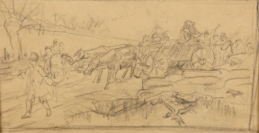Zeichnung mit Pferdekarren und Bauernvolk