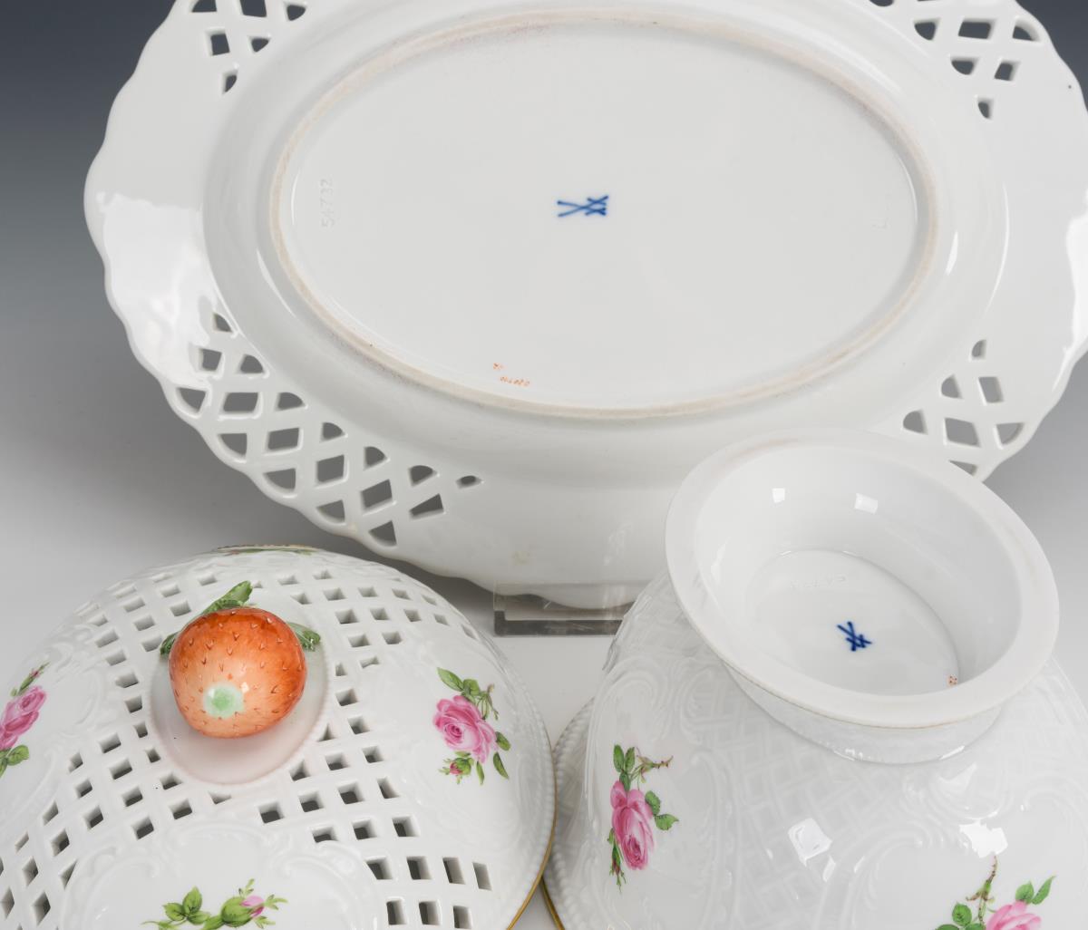 Ovale Fußschale mit Korb- und Rocaillerelief sowie durchbrochenem Deckel mit Erdbeerknauf, ovaler Durchbruchteller als Presentoir..