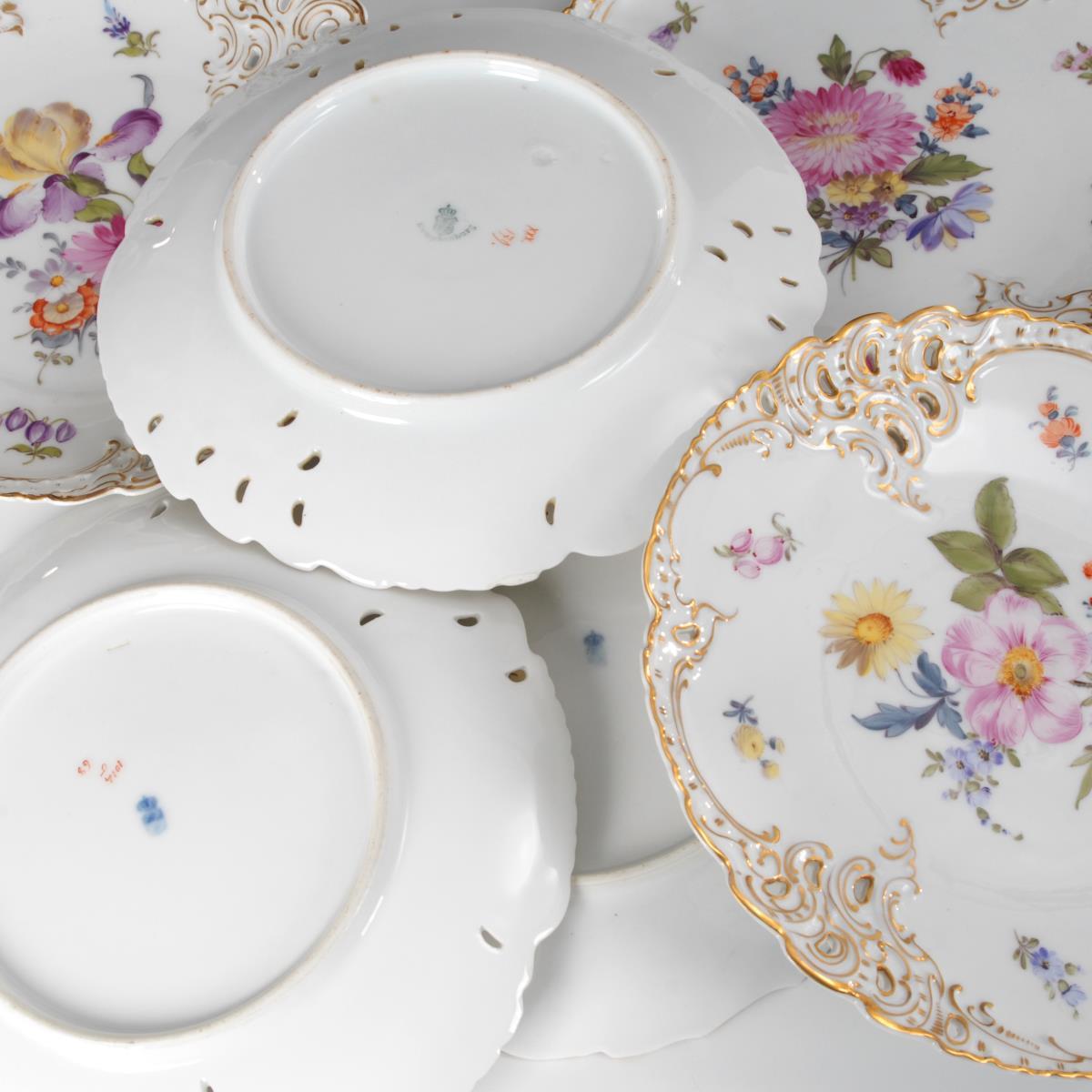 5 + 1 Teller mit Blumenmalerei. Nymphenburg. Prägemarken und Stempelmarken (3x blau, um 1900 und 3x grün, 1912-1975). Polychrom bemalt, goldstaffiert. Ø 21 cm. 5 Teller mit Rocailledurchbruch am Rand, 1 große Untertasse mit Rocaillerelief. Partieller Goldabrieb..