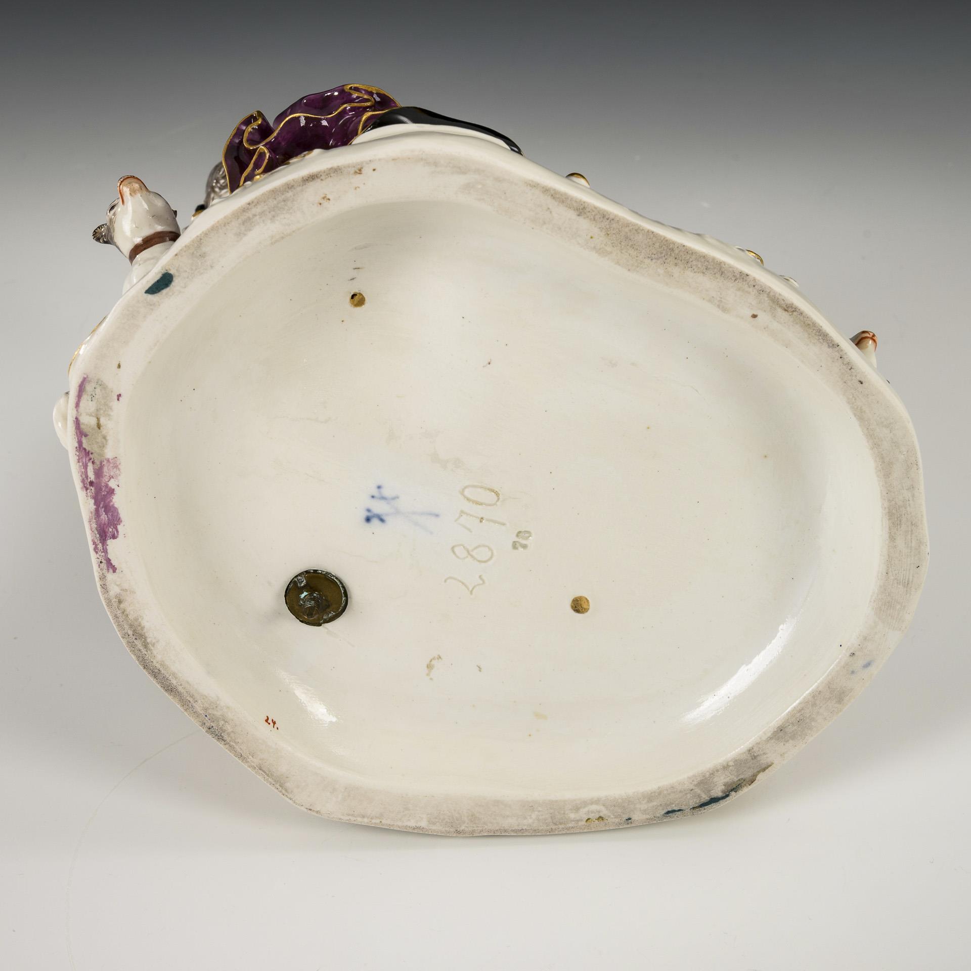 A pair of shepherds with dog and sheep sitting in front of a piece of wall, a young man with a bouquet of flowers looking out from behind the wall. Grass on the piece of wall, right leg, dog's head, both shepherd's staffs, both arms and collar of the shepherd, right arm of the shepherdess and 1 sheep's head restored.