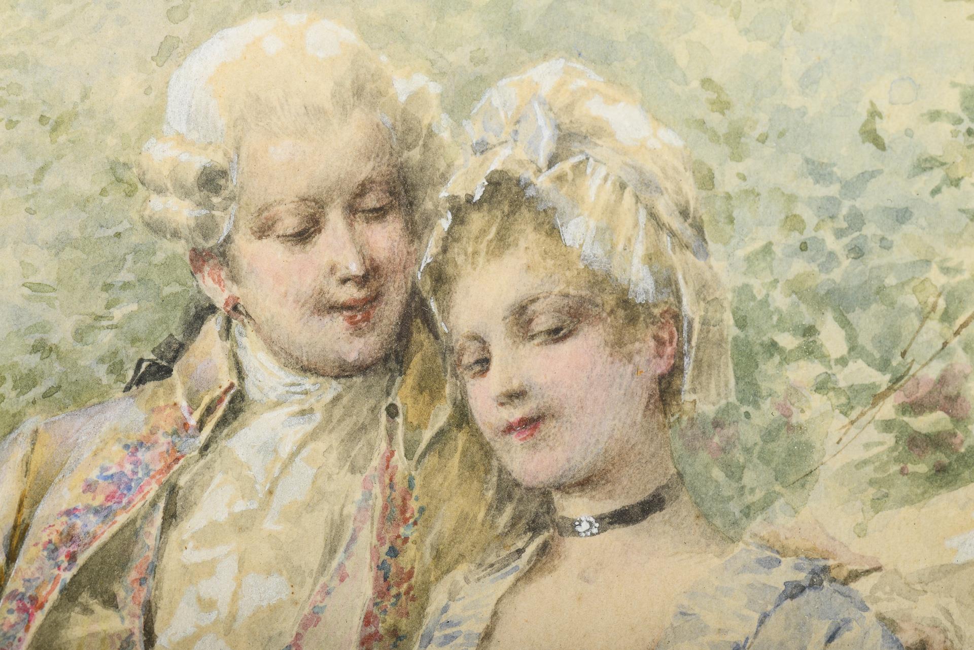 Elegant couple in 18th century fashion on a bench in the sunshine. Probably trimmed.