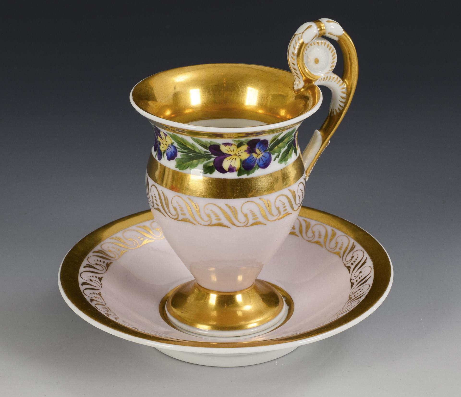 Polychrome painted, decorated in gold. Cup (h 12.5 cm), original saucer (Ø 14.5 cm).